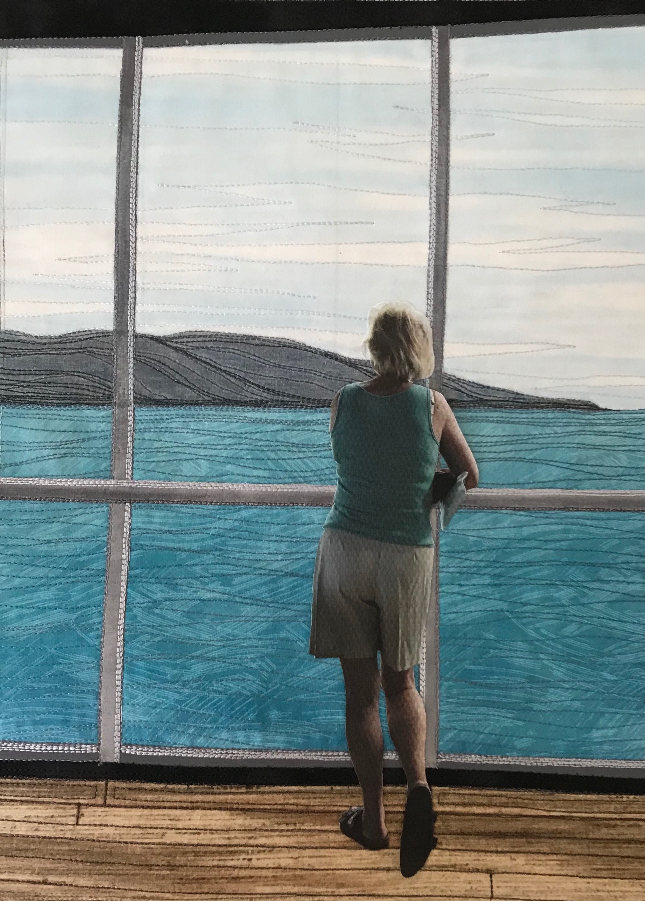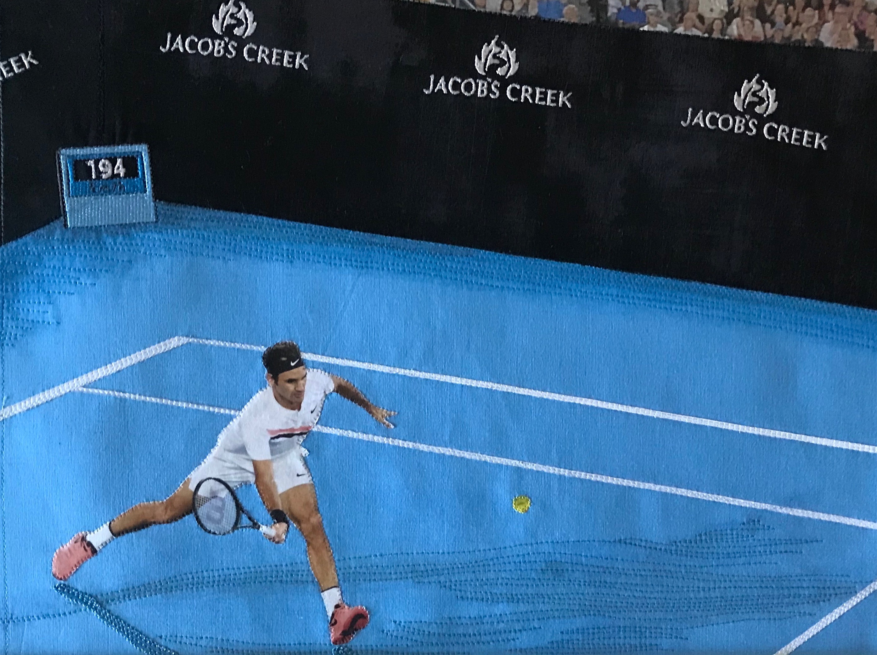 I’ve stopped for now. I’ve stitched around Federer himself using a fine clear (invisible) monofilament thread. I will likely stitch the shadows on his clothing and body and indicate the colour changes on his shirt, socks, and shoes. Tomorrow. I’ll look at it again tomorrow and see what I think then.