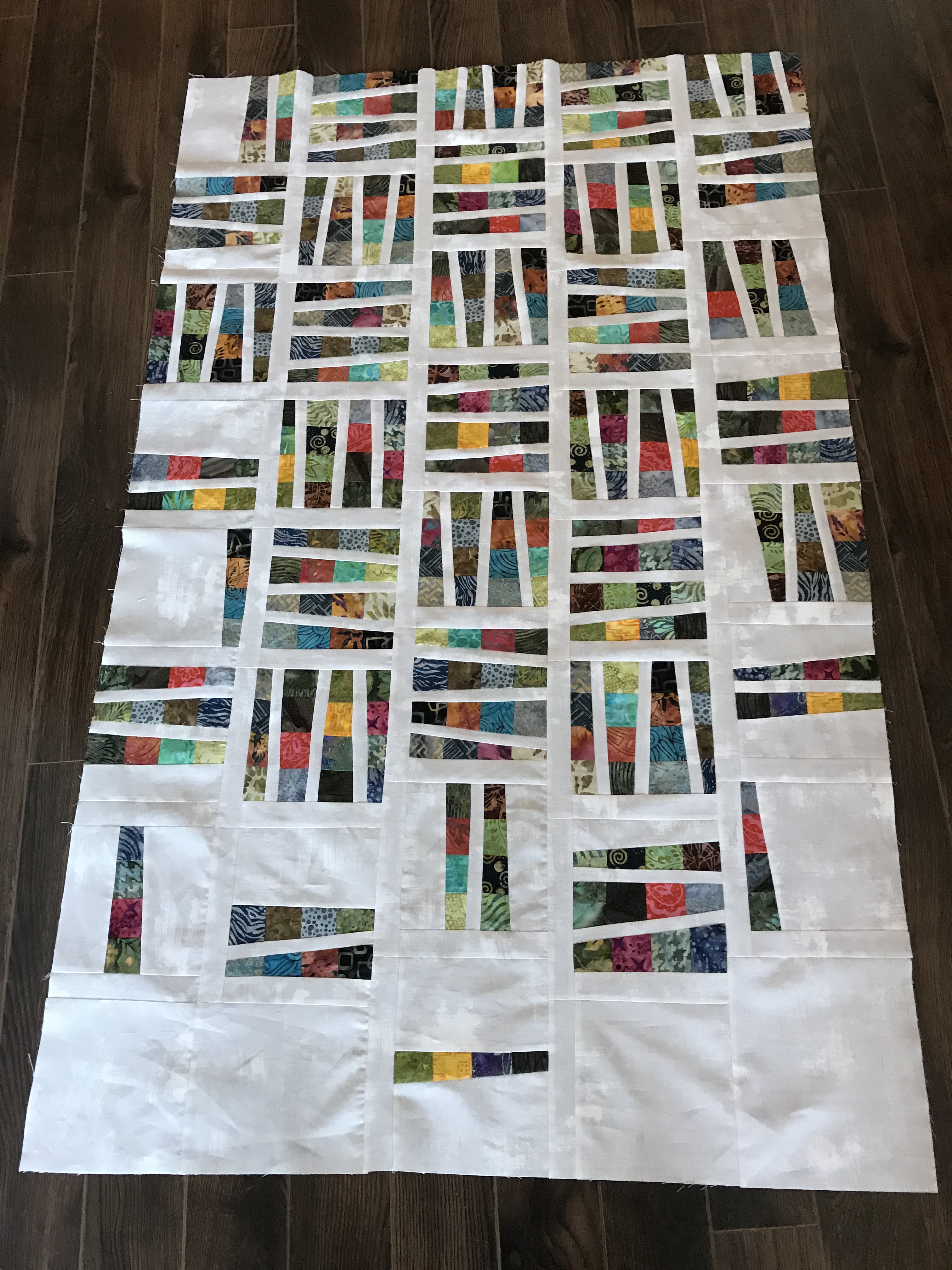 The process is now streamlined – four 6.5″ squares of pieced strips are stacked and cut into four irregular strips, laid out in order for the block, then stacked again so I can chain piece the narrow sashing to three, join the pieces and add the fourth; press, add the bottom sashing, press, add the side sashing then join the blocks in the column – it’s going quite quickly.