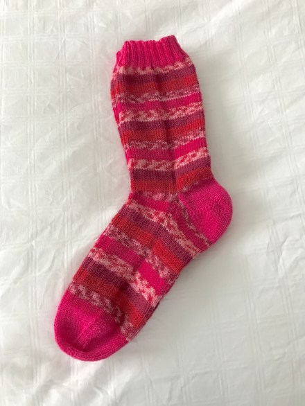 Another pair of pink socks finished last evening. Took a bit longer than usual – the variegated pattern was somewhat boring and I found myself not wanting to pick up the knitting. Anyway, finally done!