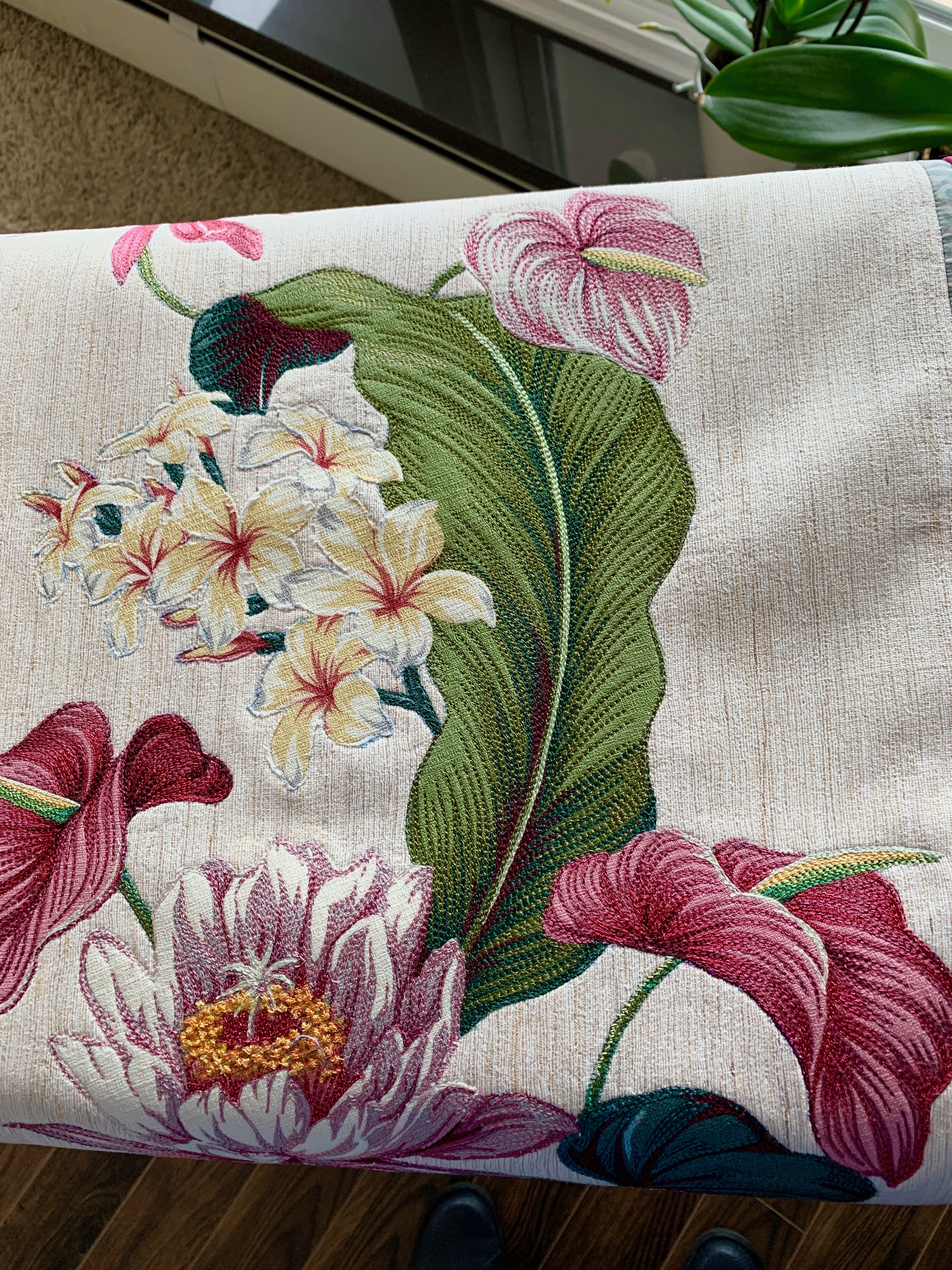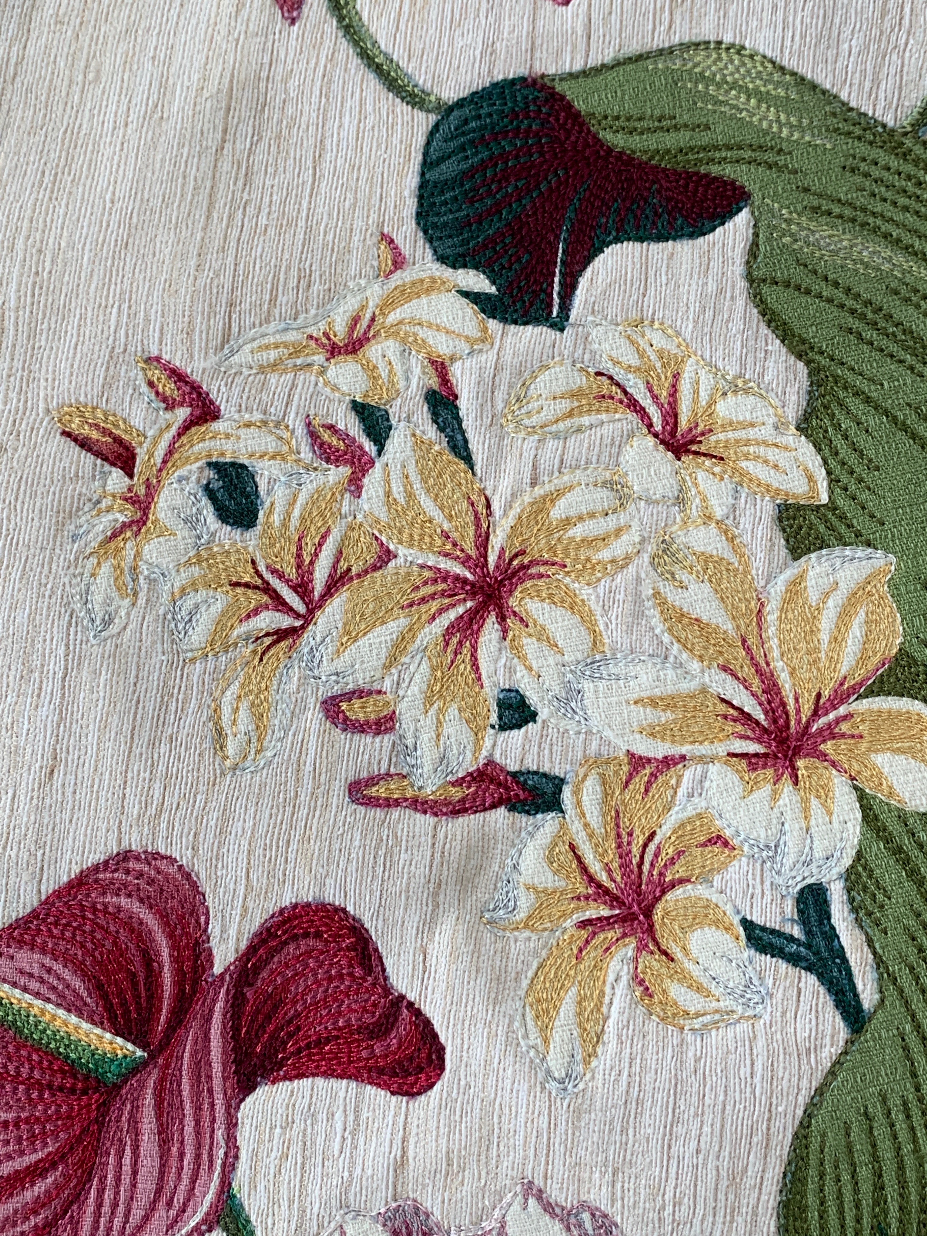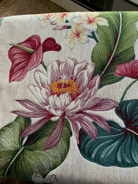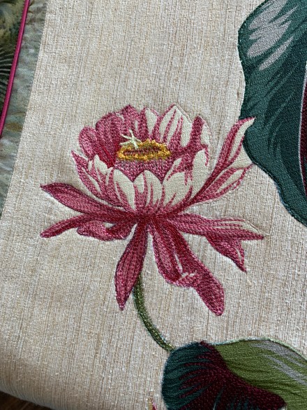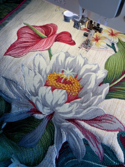 I will set up the poppy using a silicon press sheet so the fusible web on the back of the petals won’t stick to my ironing board. Once assembled, I’ll iron the completed flower in place – that’s after I build the other flower because the flower on the right overlays the smaller, one!