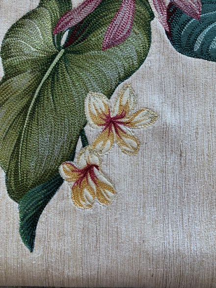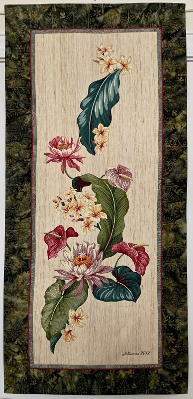 Yesterday, I started by adding fusible web to background fabric. I also did slight enlargements for a couple of parts of the image and printed them on fabric (adding fusible web to those fabric printouts). Today, I started building the background. I had laid out a piece of muslin 20″x24″ and backed it with batting; I serged around the outside to hold the layers together, then marked the horizontal and vertical centres to use for marking the 9″x12″ layout for the image. The muslin/batting functions as a canvas for the fabric/thread painting that becomes the art piece. I’ve purposely made it quite a bit larger than the image to give me lots of room to frame, then trim the piece.