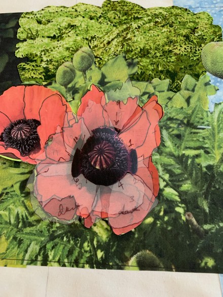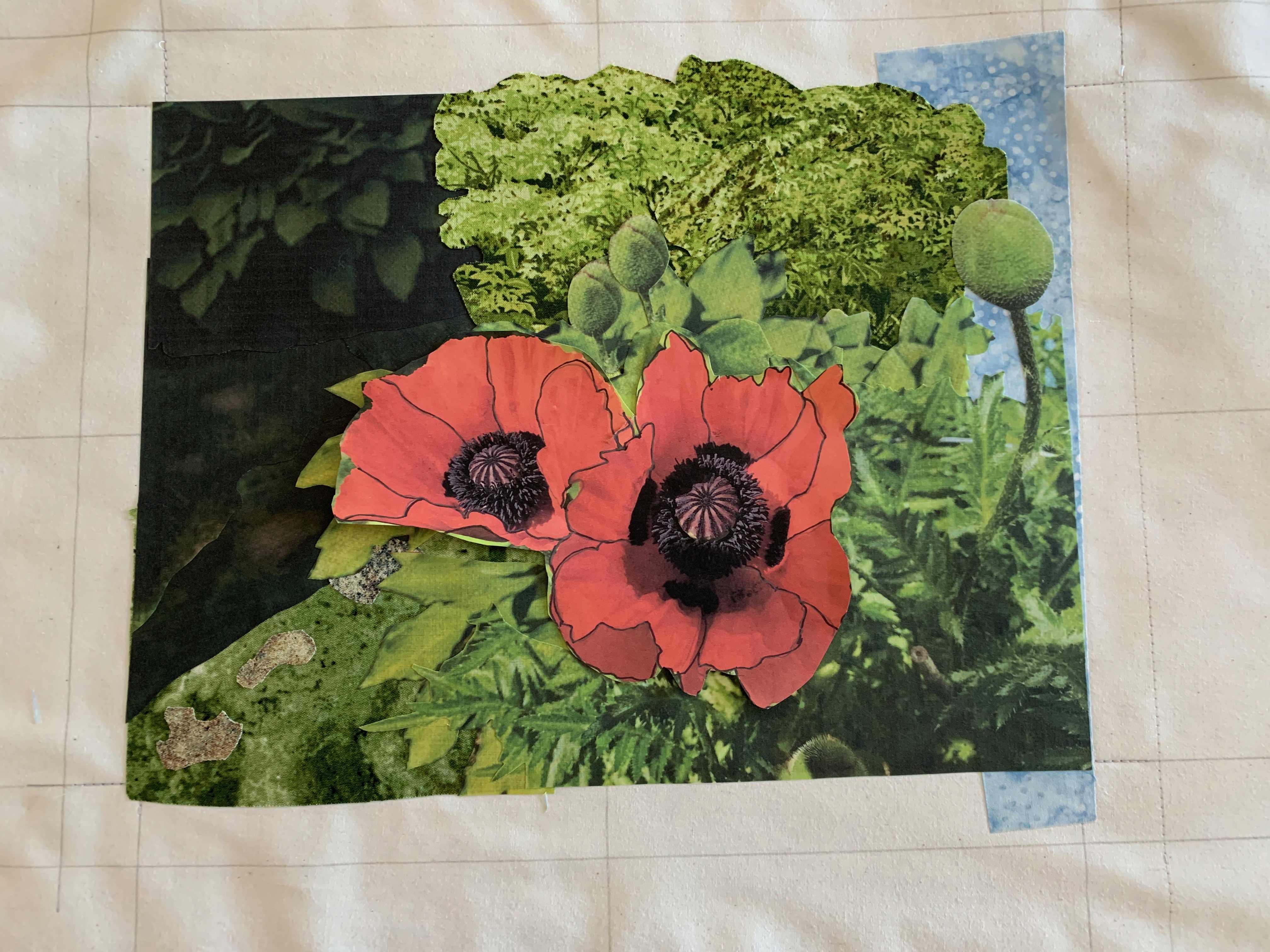Rather than trying to piece the hosta in the upper left corner I elected to use the image printed fabric and I will add definition with thread painting. Same with the poppy leaves – they are very fine and frilly and I didn’t have any fabric that implied the texture so I also chose to use the image printed fabric for them as well. The taxus, the grass, and the blue house are filled in with printed/batik fabrics. I pressed the elements into place leaving an opening for the poppies which, for the moment, are being shown with an outlined paper cutout.