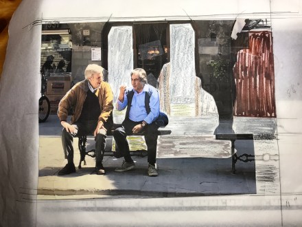 With the other people removed and just the shops behind, the men now stand out – I removed the advertising from the supermarket windows – I will do them in the same dark colours you can see through the open shop door. I intend to keep the partial bench on the right (having taken away the woman who is reading and smoking).