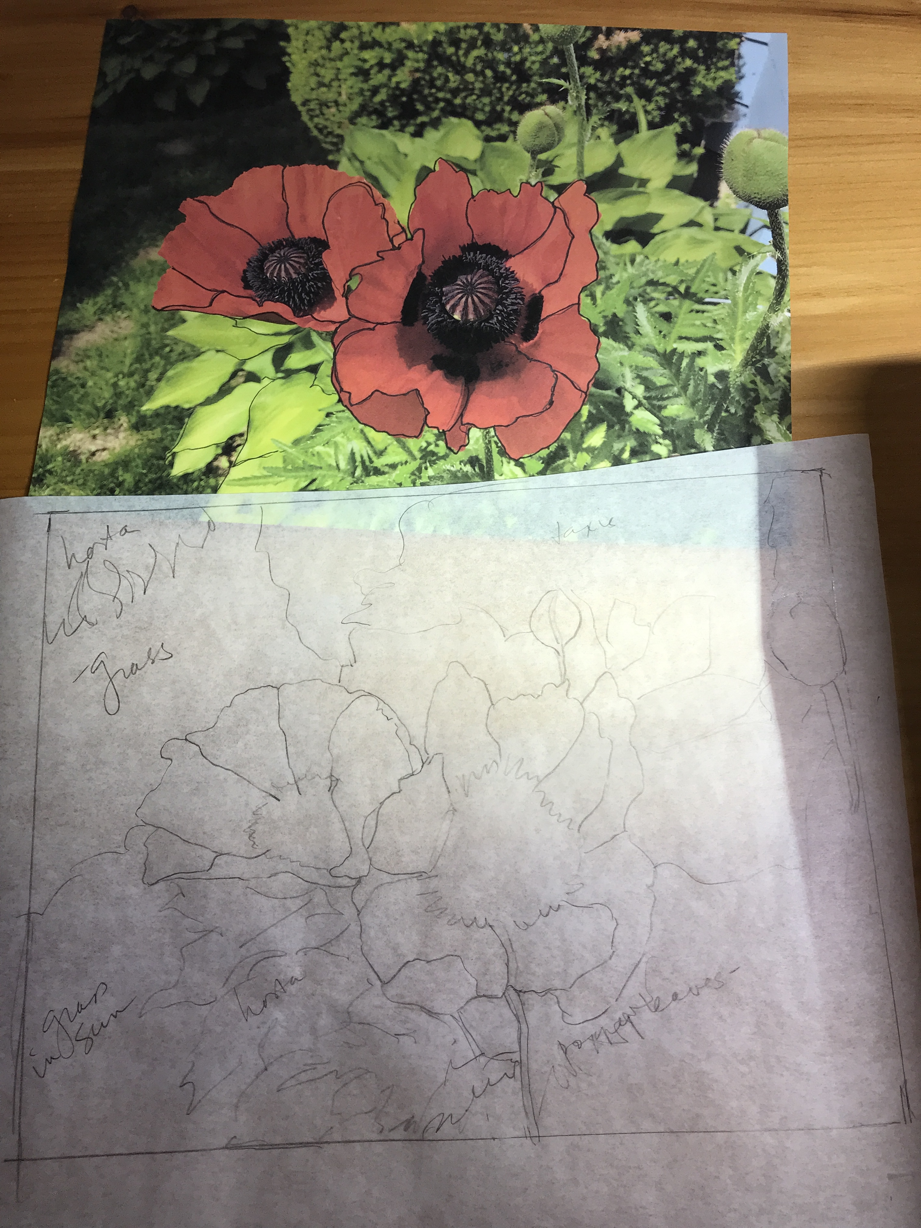 It’s not enough that I’m taking on this project, I’m also working on a second. I took photos of some poppies in Marlene’s front garden this summer and these two oriental poppies are striking. I started by outlining the petals so I could do a tracing which I’ll use for cutting out red fabrics. They’re growing beside a light green hosta, with a taxus shrub behind and a darker hosta in the top left corner.