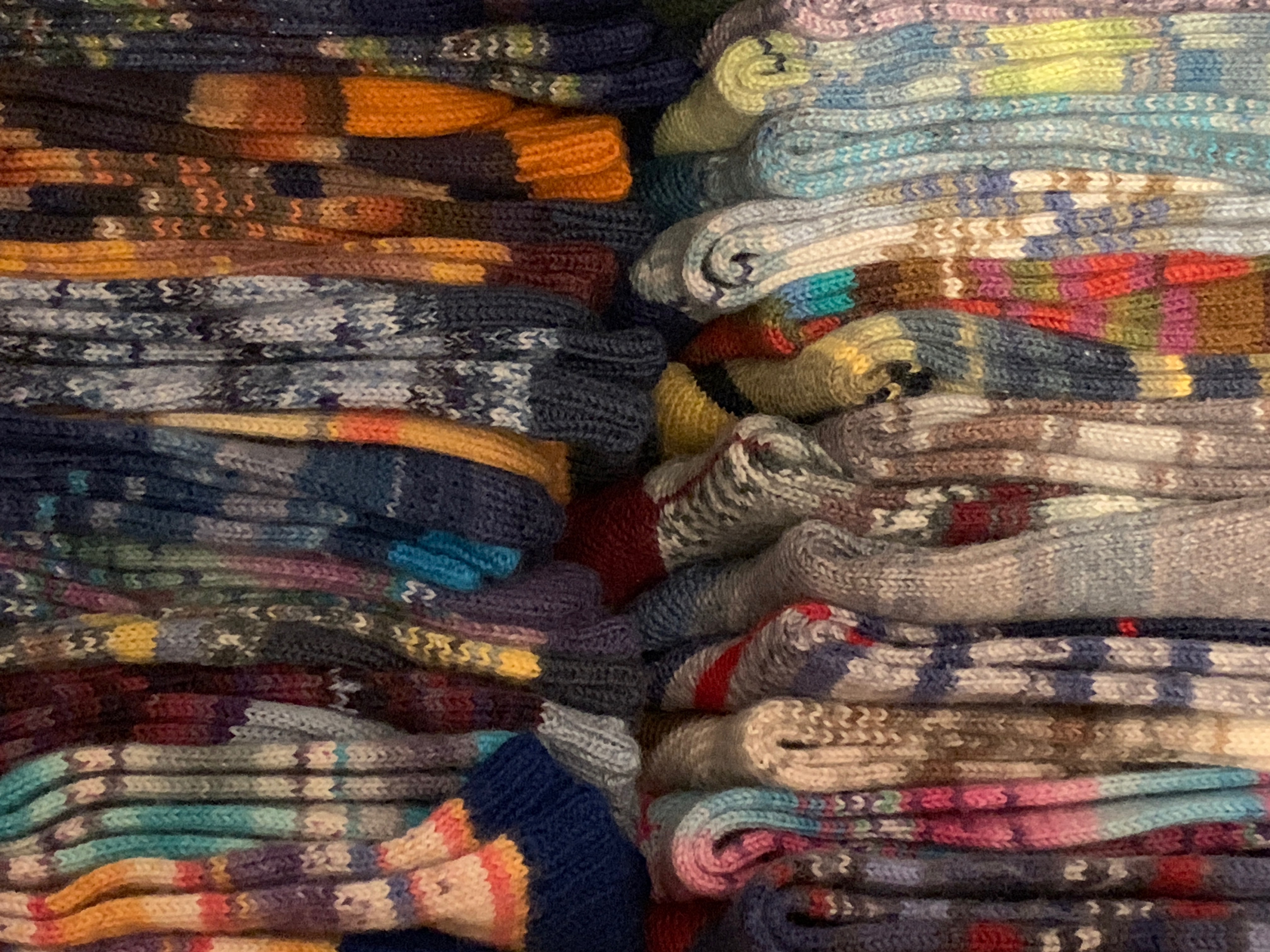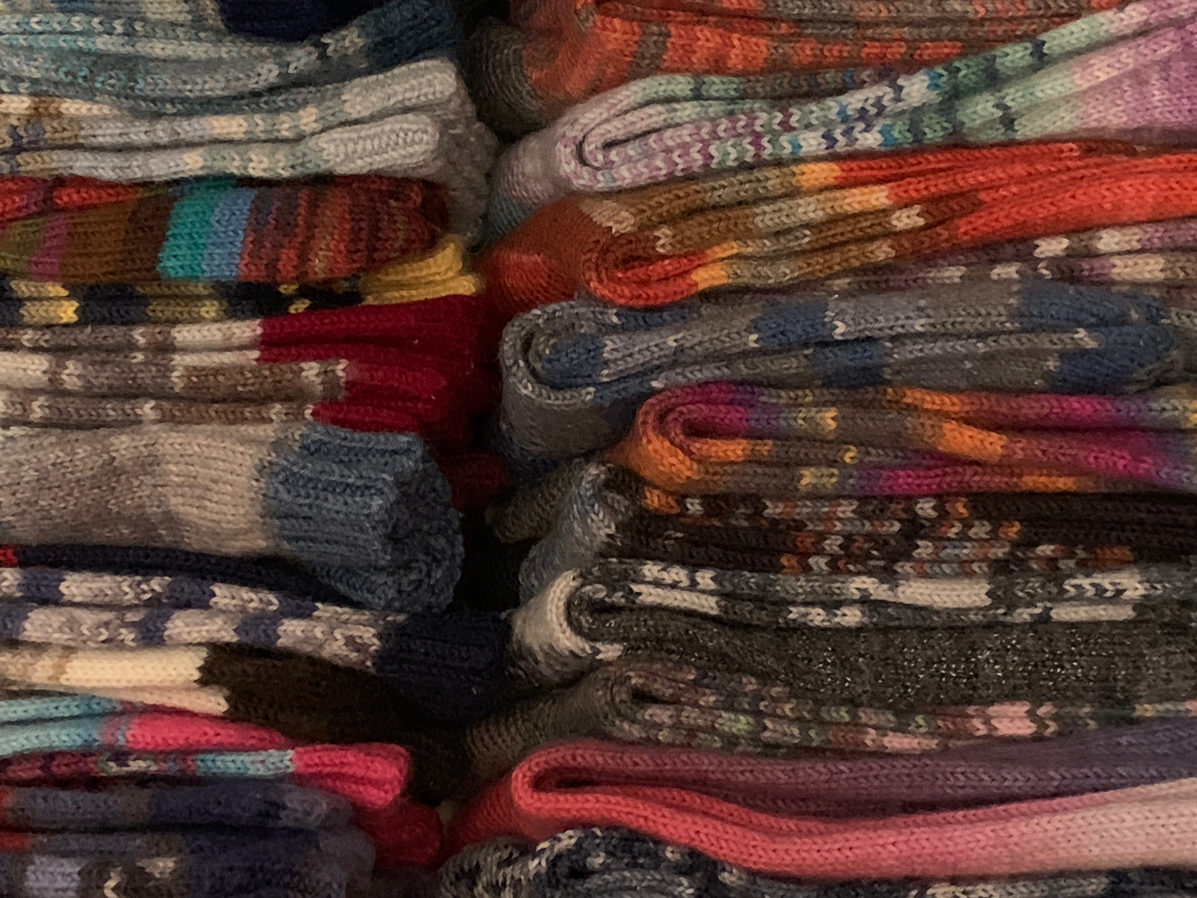 Here it is in two steps – I have three columns of socks in my sock drawer (43 pairs in all) of hand knit woollen socks – the oldest knit in 2003 to the most recent 2019. I have given away many pairs from this sock drawer – worn, yes, but with lots of life left in them, in order to be able to add new socks to my collection.