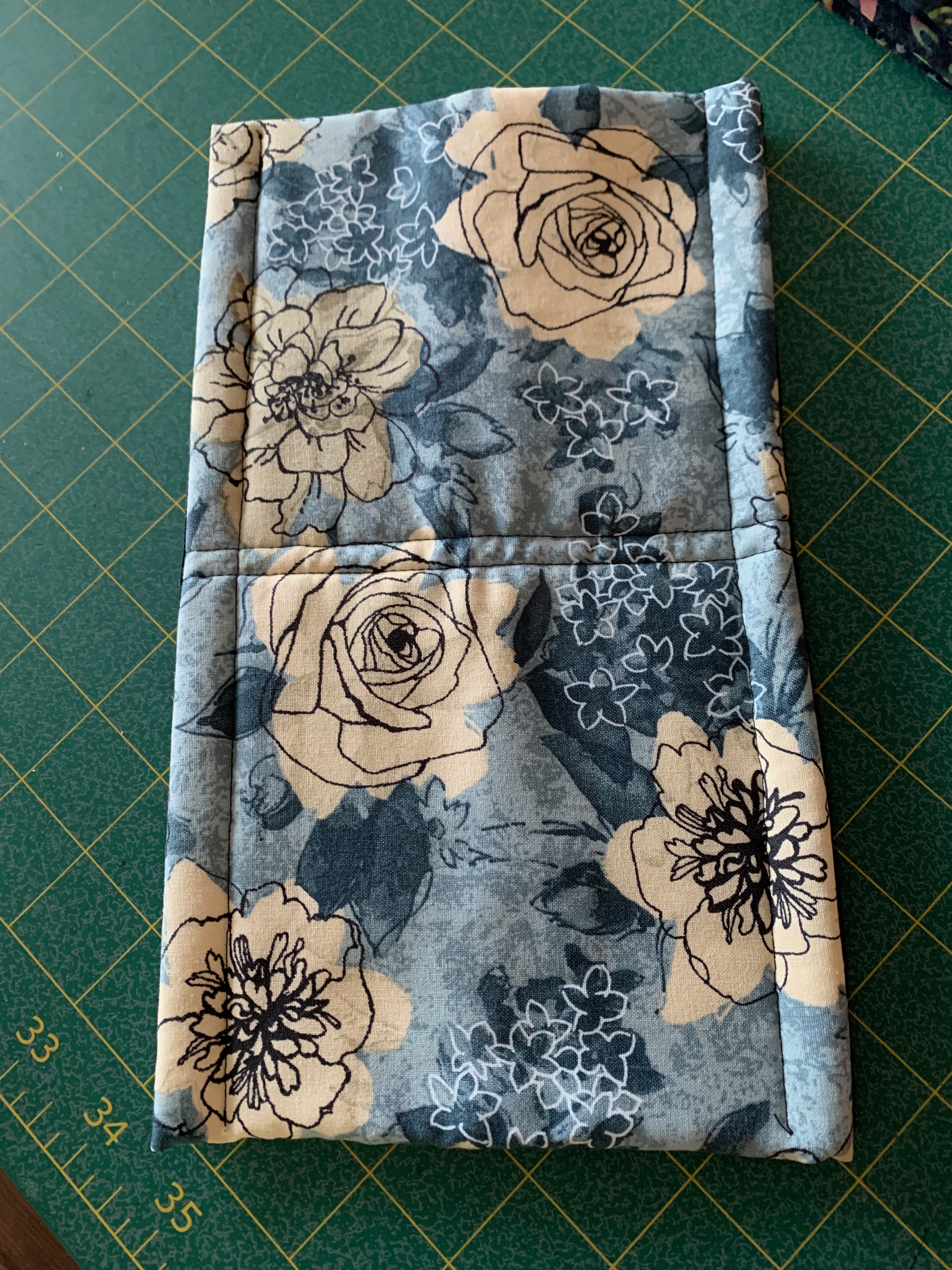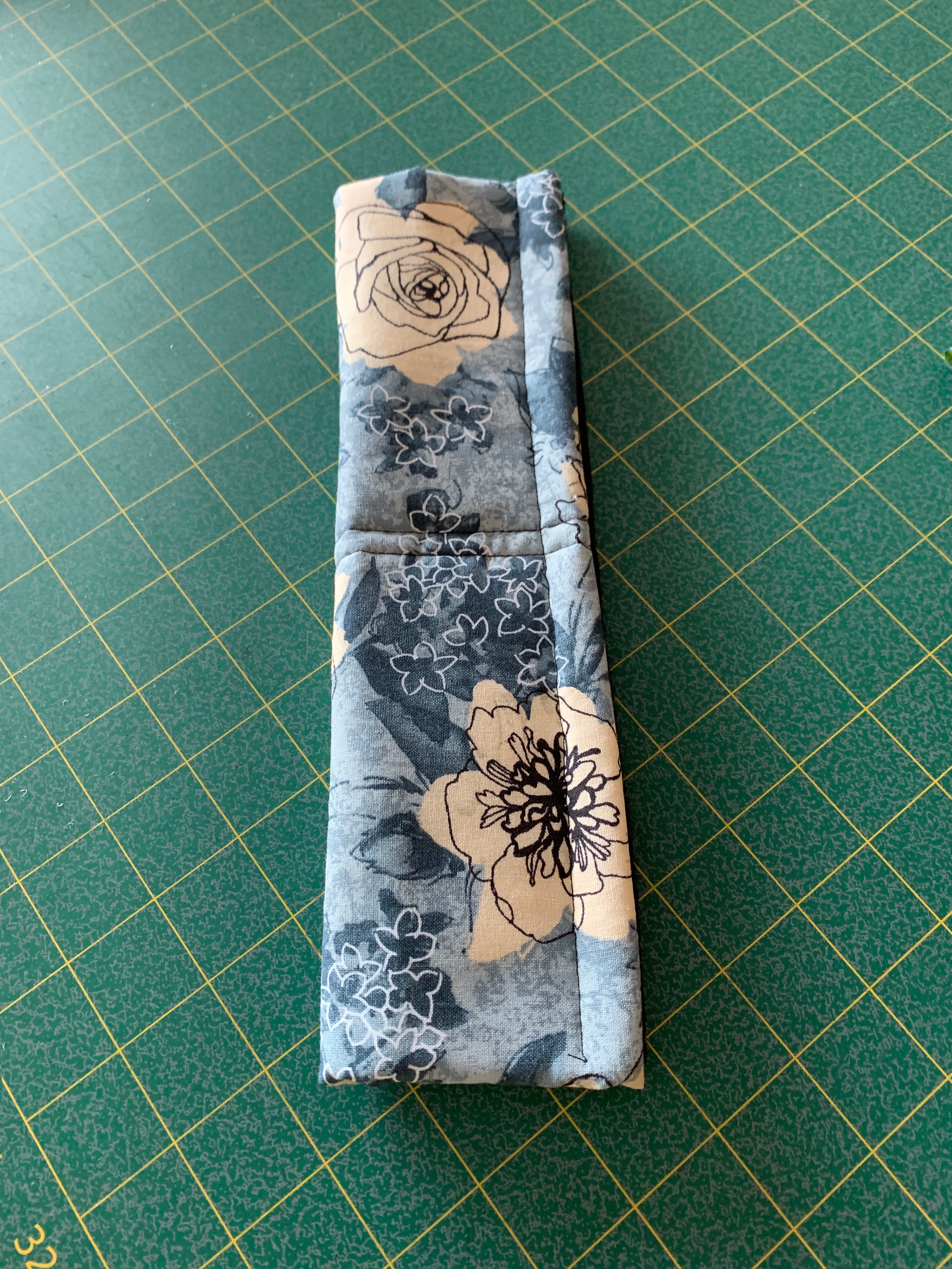 Folded in half, I cut 7″ strips from the width of fabric – cut in half gives me 2 pieces of fabric 7″ x ~21″. I cut batting 6″ x 21″. Place the batting in the centre of the fabric, fold in one end, fold over the second (selvedge edge on top so I don’t have to fold raw edge under).