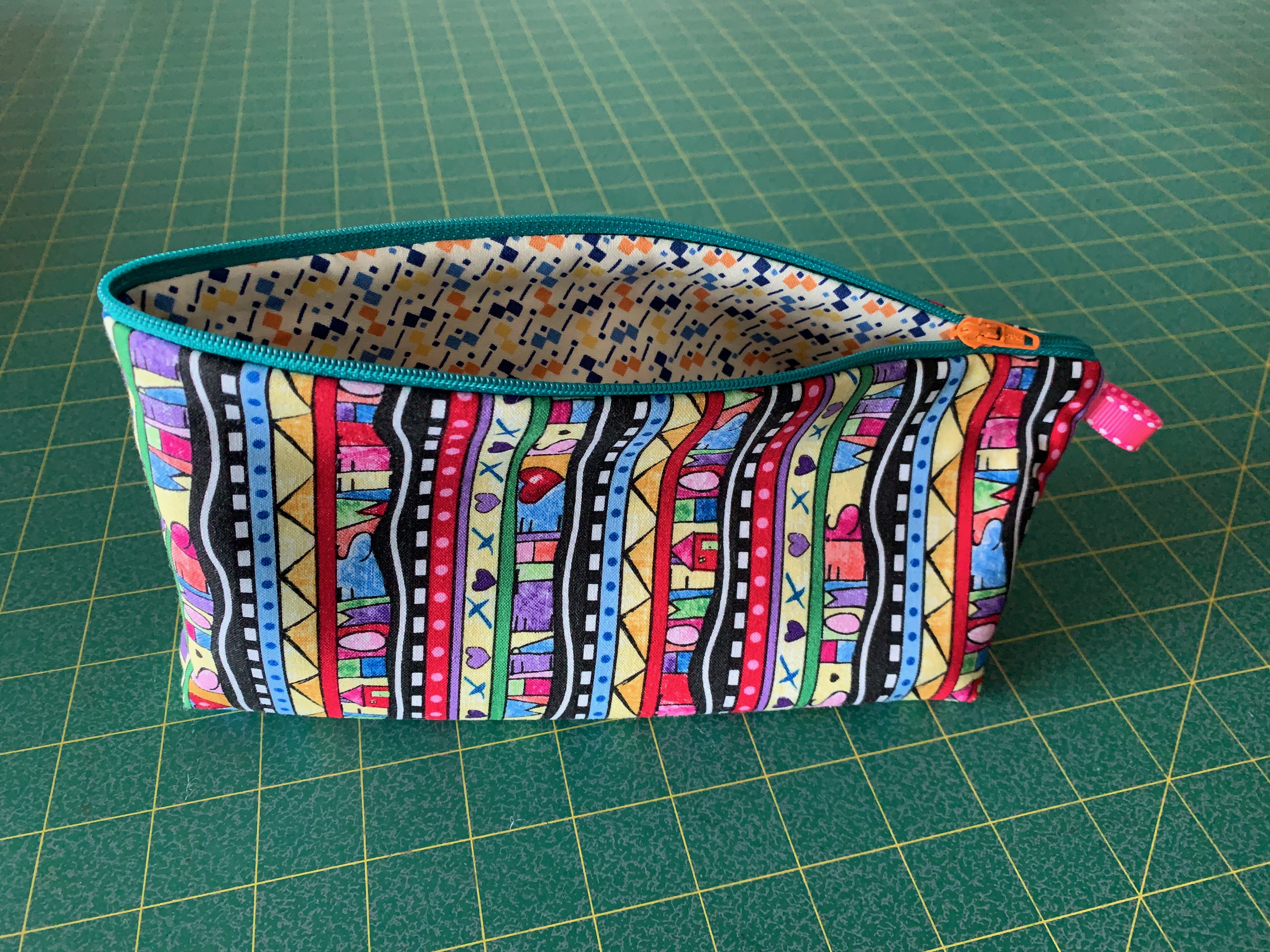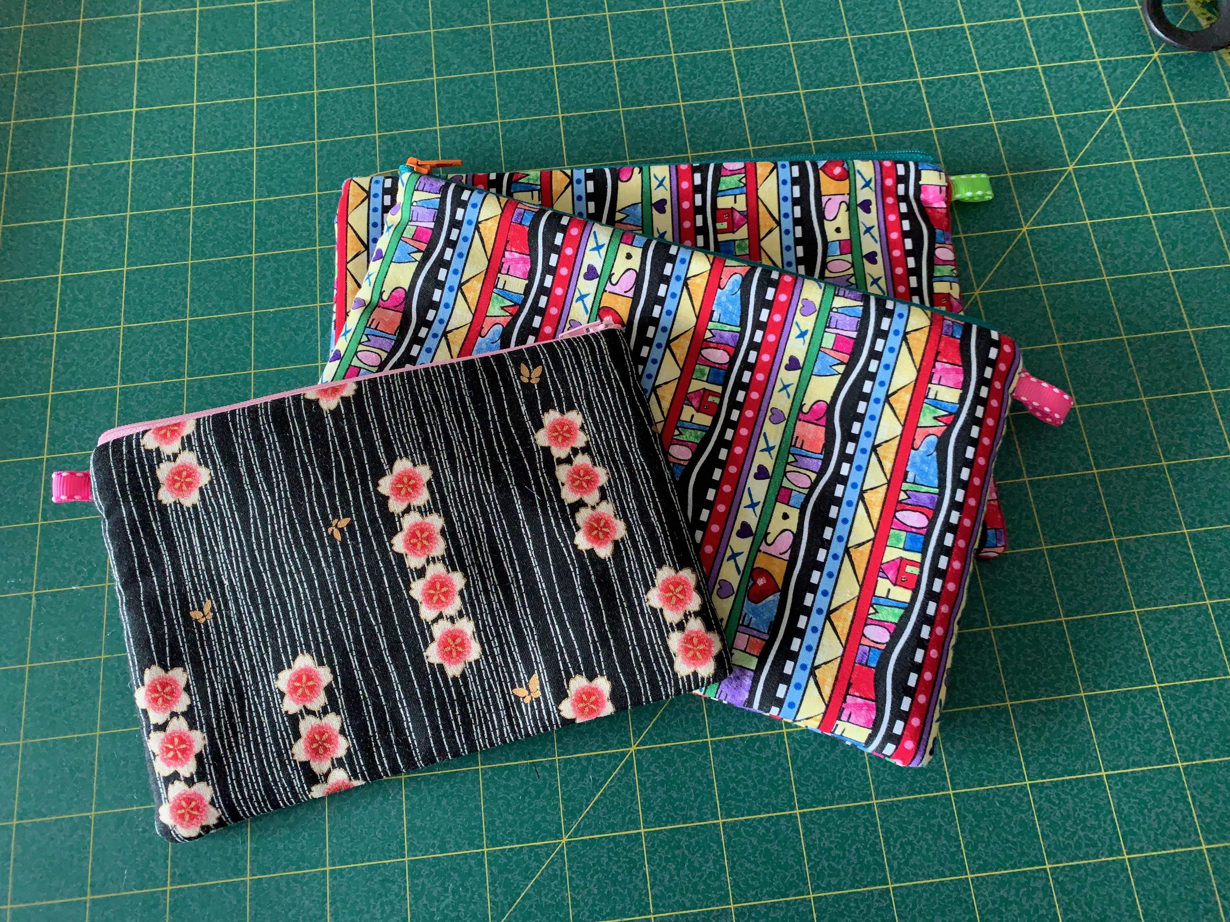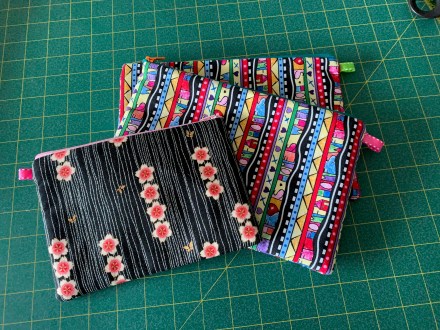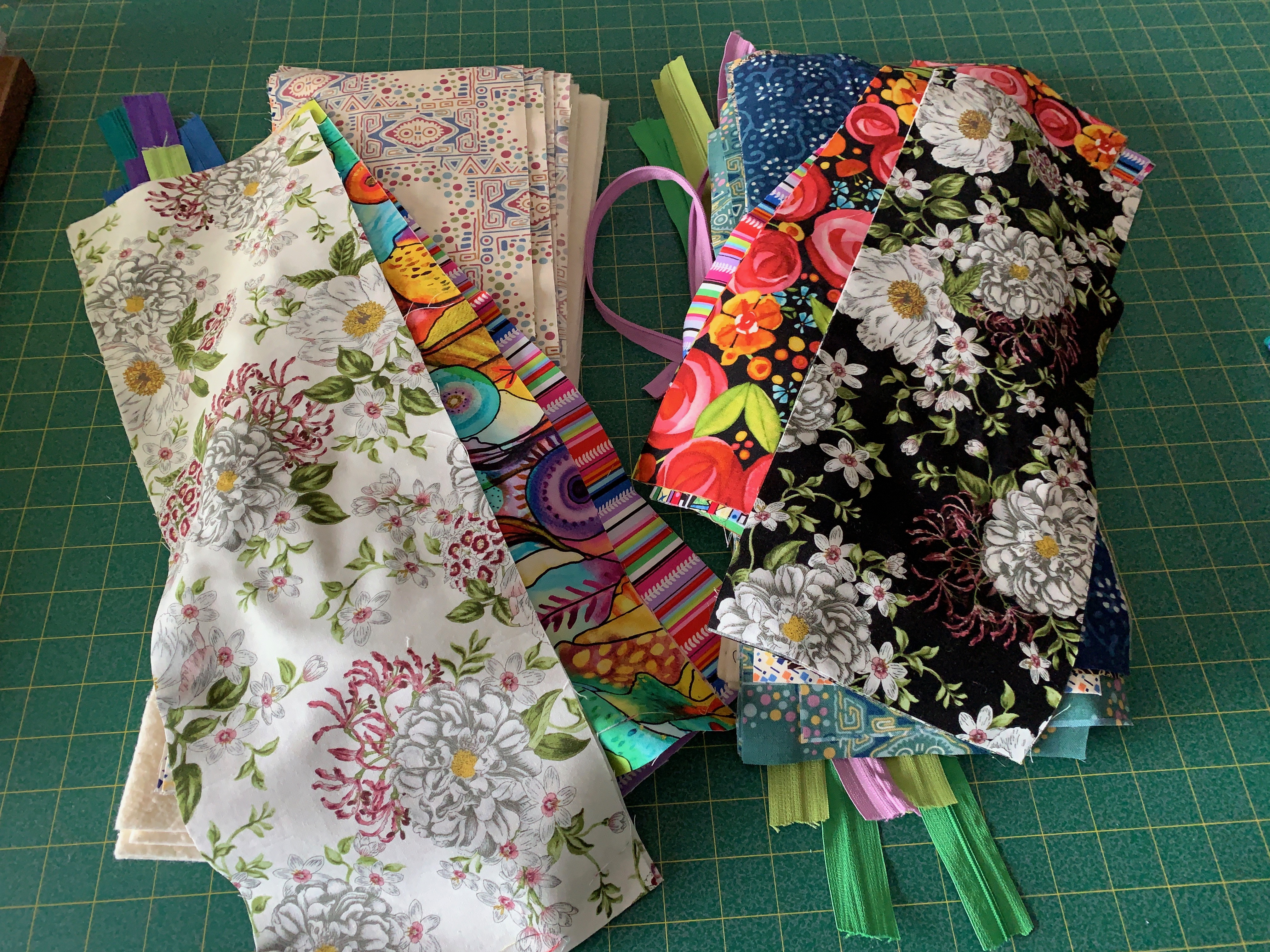 I dug out the bright fabrics I had set aside to make bags and cut it into appropriate sizes (17″ x 6.25; 21″ x 7″). I cut batting scraps into similar sizes as well. Found suitable (dull) fabric in my stash to be lining for the bags. I went through my zipper tape and cut enough lengths to the correct size.