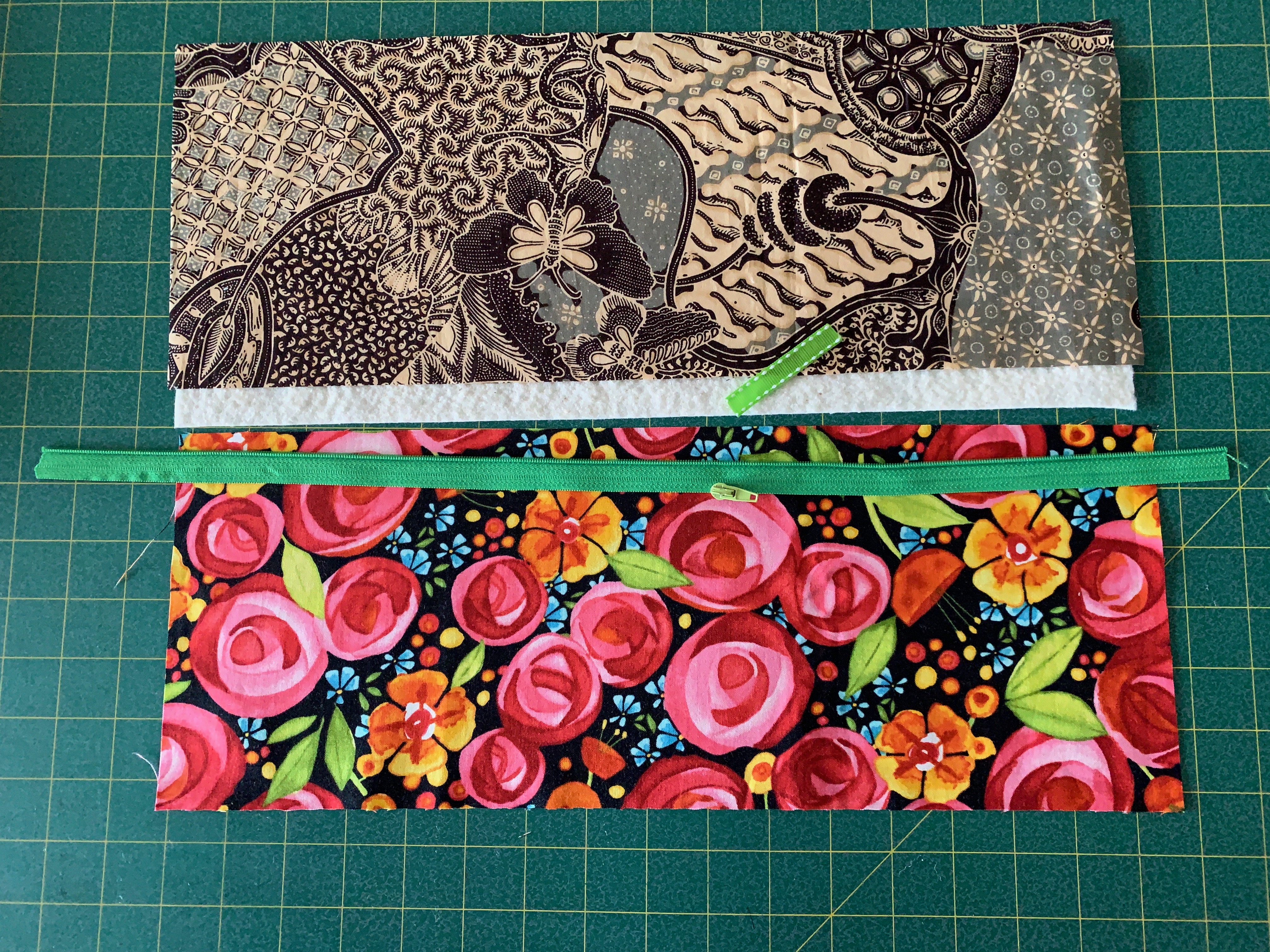 To make a bag I need one outer piece (twice the width of the finished bag), one lining piece, a piece of similar size batting, one half of a zipper tape cut to length, a zipper slide, and a short piece of grosgrain ribbon.