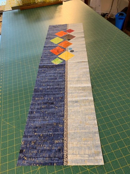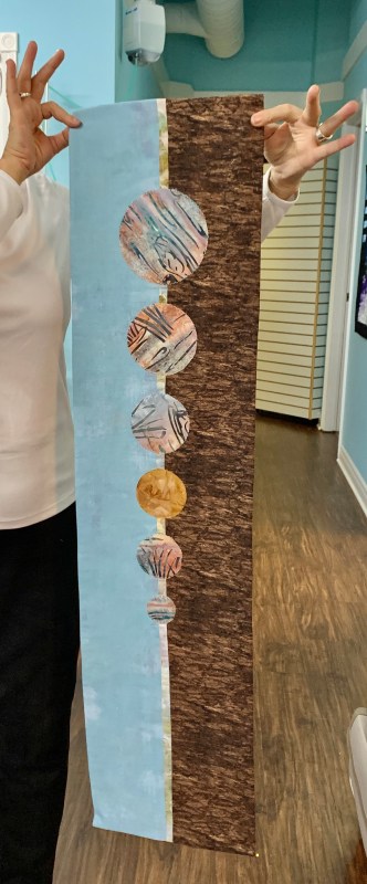 To prepare for the class, I set up four skinny quilts as examples. I’d sewn backgrounds using narrowish width of fabric cuts from complementary fabrics and then cut out and arranged on each some shapes (to which I’d already added fusible web).