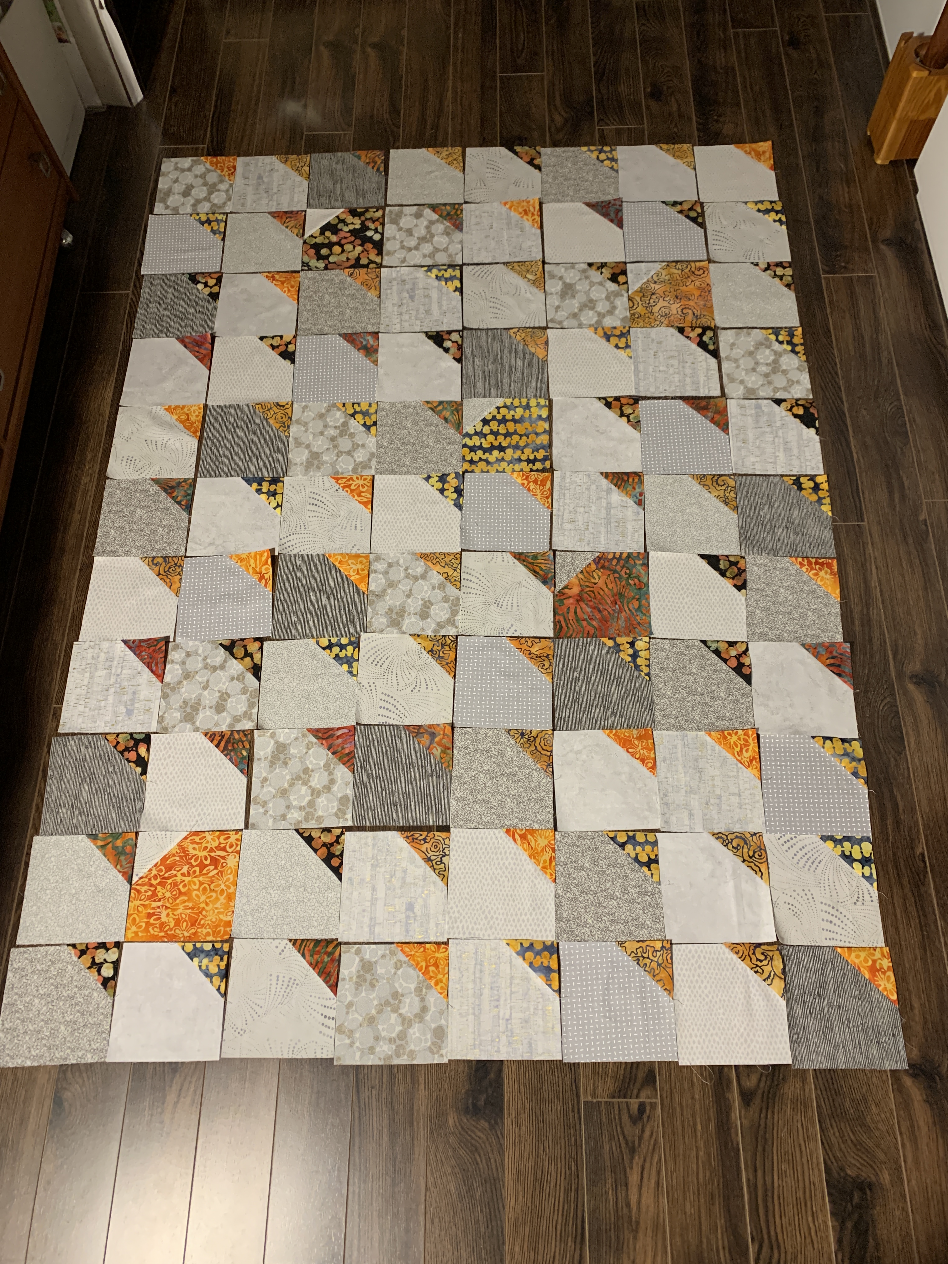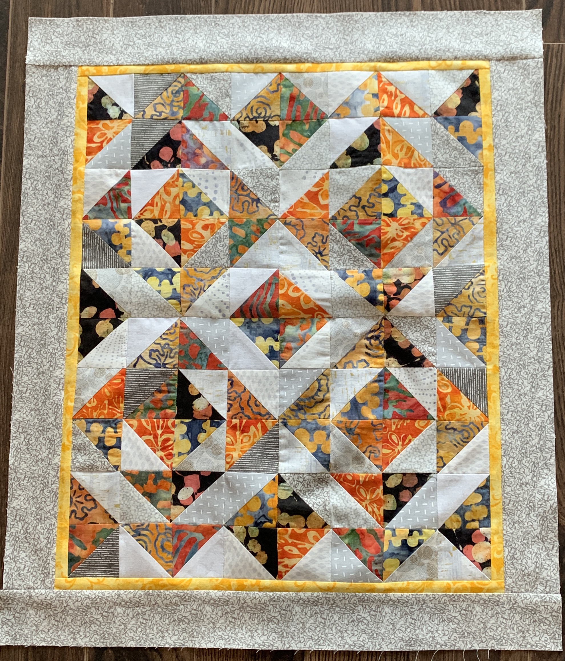 Today, I assembled the blocks for the original lap quilt project – a simple but colourful construction which I began at the sewing retreat. The half-square triangles used in the wall hanging came from the corner offcuts from the quilt blocks so you can tell how small the half-square triangles really are.