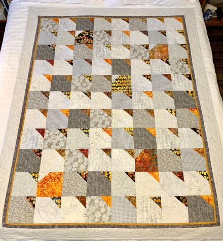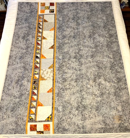 Finished this quilt a couple of days ago, now. Although a very simple quilt, I find it’s simplicity appealing and I’m happy with how it turned out. I particularly like how the two narrow borders frame the inner panel bringing out the darker greys and highlighting the golden colours in the batik fabrics.