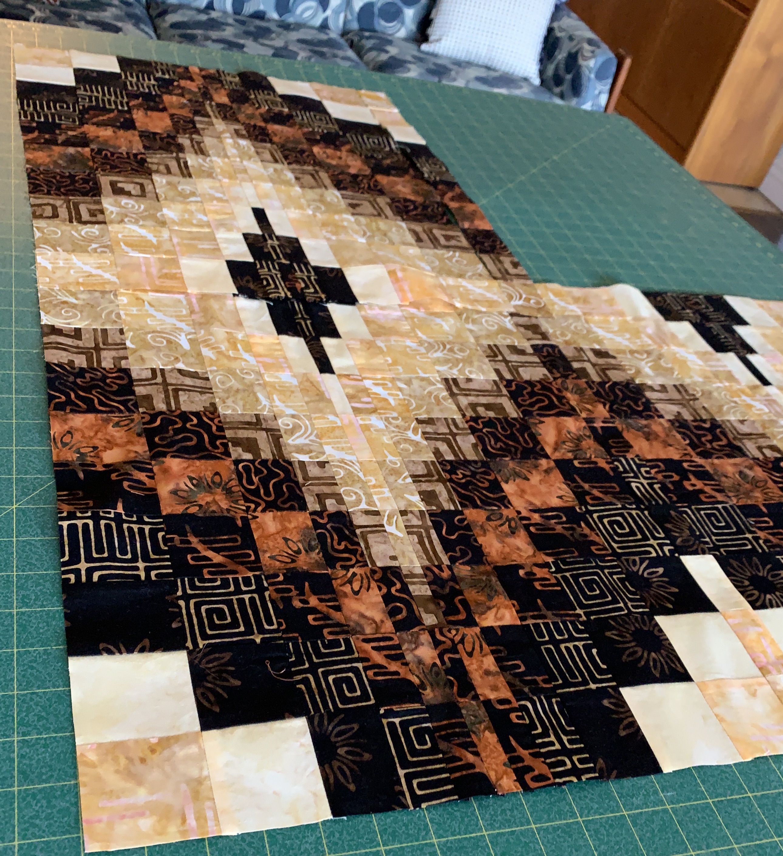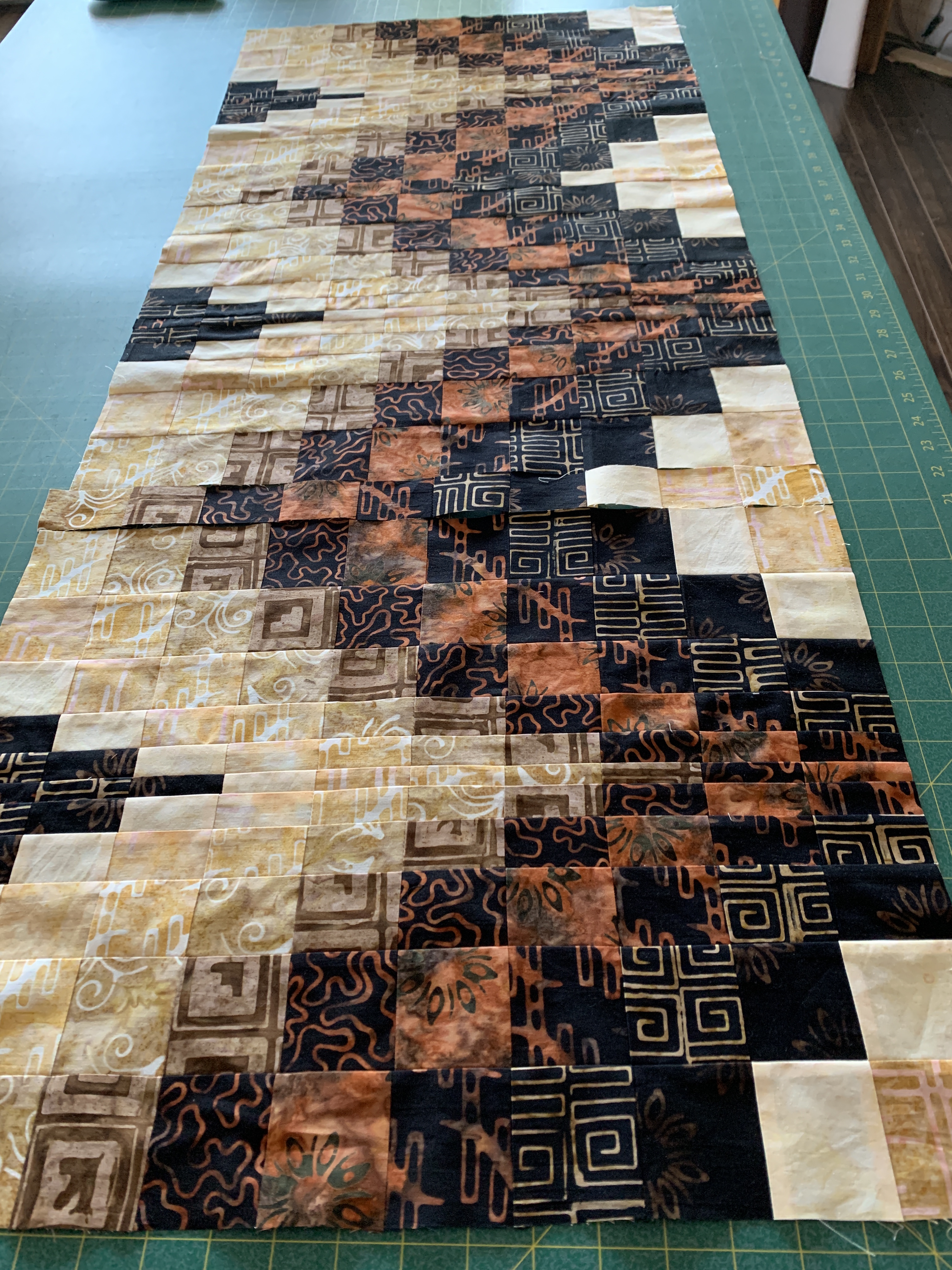 My fabric for this runner came from a 5″ wide 20 strip jelly roll with a lovely range of contrasting colours. I selected 10, deciding to use the bronze as the contrast fabric and situated it between two of the black/bronze strips. 5″ allowed me to cut 2 x 2 1/2″ set – precisely what I needed for 4 bargello blocks.