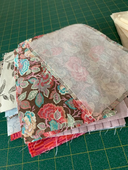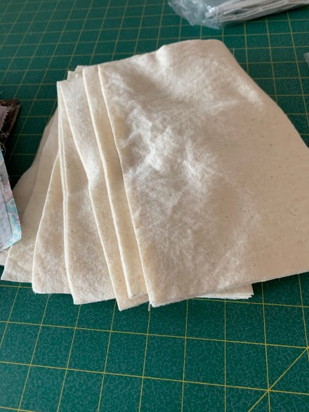 Next, I cut what non-woven fusible interfacing I had on hand into 8.5″ x 5.5″ rectangles and fused them to the back of the fabric. The 1/4″ seam allowances will be less bulky without the interfacing included and because the interfacing is fused to the fabric, it’s going nowhere. I was able to prep 56 pieces of cut fabric. Now I have to go looking for more non-woven fusible interfacing.