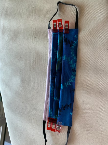 With the side seams sewn, turn the mask right side out, press flat. Next, I slipped a piece of pipe cleaner (I’ve also used twist ties) into the fold opposite from the opening (Leah put the pipe cleaner on the near side – I think the opening lays flatter with my adaptation leaving the opening at the bottom rather than the top of the mask). I used a clip to hold the pipe cleaner in place.