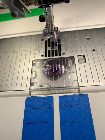 Along the way, I realized I didn’t need to measure each mask for the first seam with the opening in the middle – I positioned a piece of green masking tape at the start point where I could align one edge, and the marks on the blue masking tape mark the positioning on the second edge. Sewing the seam with the opening went quickly after that.