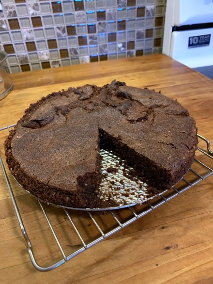 First, there’s an ambiguity in the recipe – it calls for 2 cups (7 ounces) of almond flour – well, which is it? 2 cups or 7 ounces (and BTW my cup = 8 ounces, not 7, but I ignored that discrepancy.) I added 1 cup of almond flour at the appropriate place in the recipe, mixed it into the batter, and I thought the batter looked reasonably thick at that point but to be on the safe side, I added another 1/4 cup scoop of almond flour, just in case the batter really needed more. I’d say, having sampled the cake, that it’s just a tad on the dry side and next time I’d only add a single cup of almond flour.