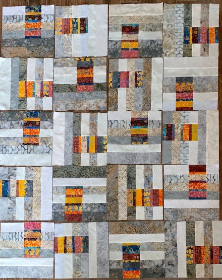 I’ve just finished 20 blocks (actually I have 23 and could probably eke out a 24th – to use on the quilt back). The question is now what?