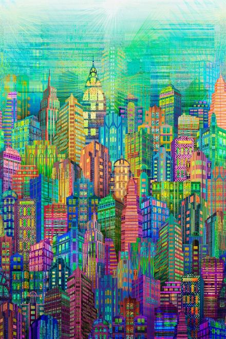 I didn’t buy a full panel – the fabric is 106″ wide! – I bought a metre (40″) which is most of the pattern. Use the multi-coloured buildings cut out as, say, the Pie pieces with some kind of blender – a grunge of some colour – as the “L” pieces with the fillers done using fabric from the panel – I think I’d end up with something quite unusual. That might be my next project… (after a couple of garments).