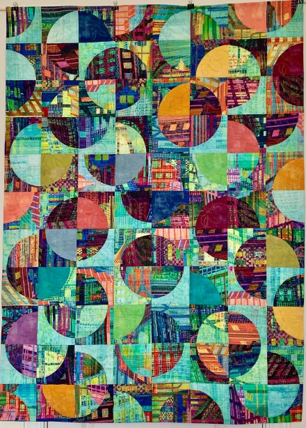 Yesterday I completed 25 blocks for this quilt – it’s starting to look like I want it to – circles on circles. Nothing is in place for sure yet – can’t be until I have all 63 blocks stitched and trimmed. I know there will be movement once I get the layout on the floor to audition all the blocks at once.