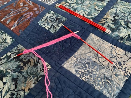 Here’s how I set up to knit in the round – I use double pointed needles because I find them easier than having to continually slide stitches along on a circular needle (when you can find one short enough for sock knitting).