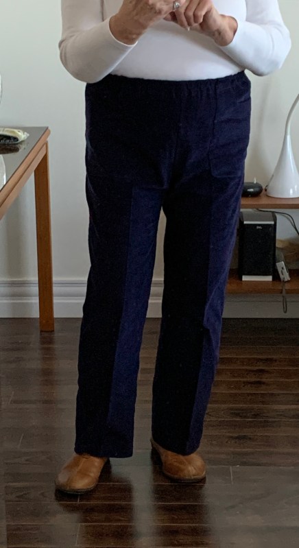 They’re wearable although I found yesterday that I was hiking them up more than I had to with the burgundy pants which pretty much stay at my waist in the back when I sit down. These do slip down some – may have to do with the stiffness of the fabric – the burgundy is a much softer corduroy, although the navy seem to stay up reasonable well (I’ve got them on now). I discovered, and recorded, that my inseam on these pants is 26 1/2″, the side seam ends up at 37″. That information now takes any guesswork out of making up this pattern.