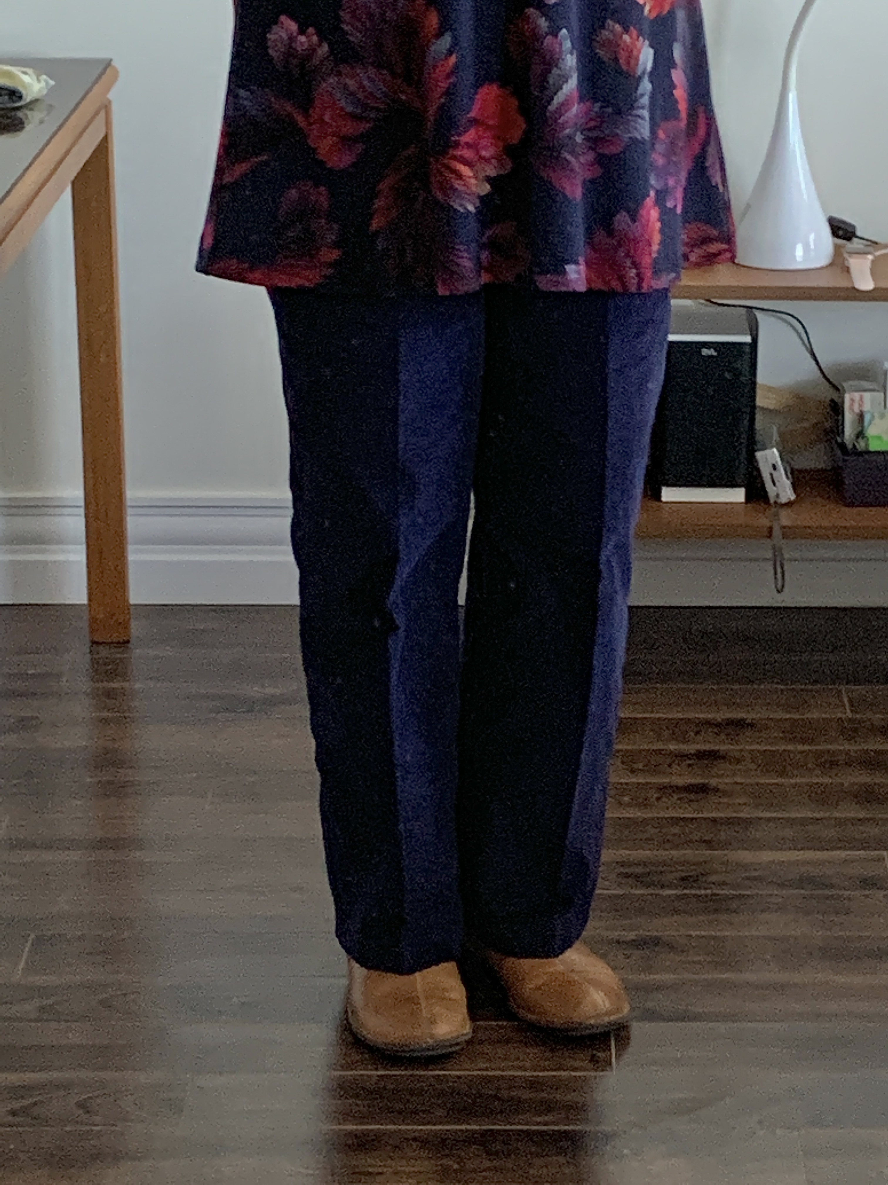 They’re wearable although I found yesterday that I was hiking them up more than I had to with the burgundy pants which pretty much stay at my waist in the back when I sit down. These do slip down some – may have to do with the stiffness of the fabric – the burgundy is a much softer corduroy, although the navy seem to stay up reasonable well (I’ve got them on now). I discovered, and recorded, that my inseam on these pants is 26 1/2″, the side seam ends up at 37″. That information now takes any guesswork out of making up this pattern.