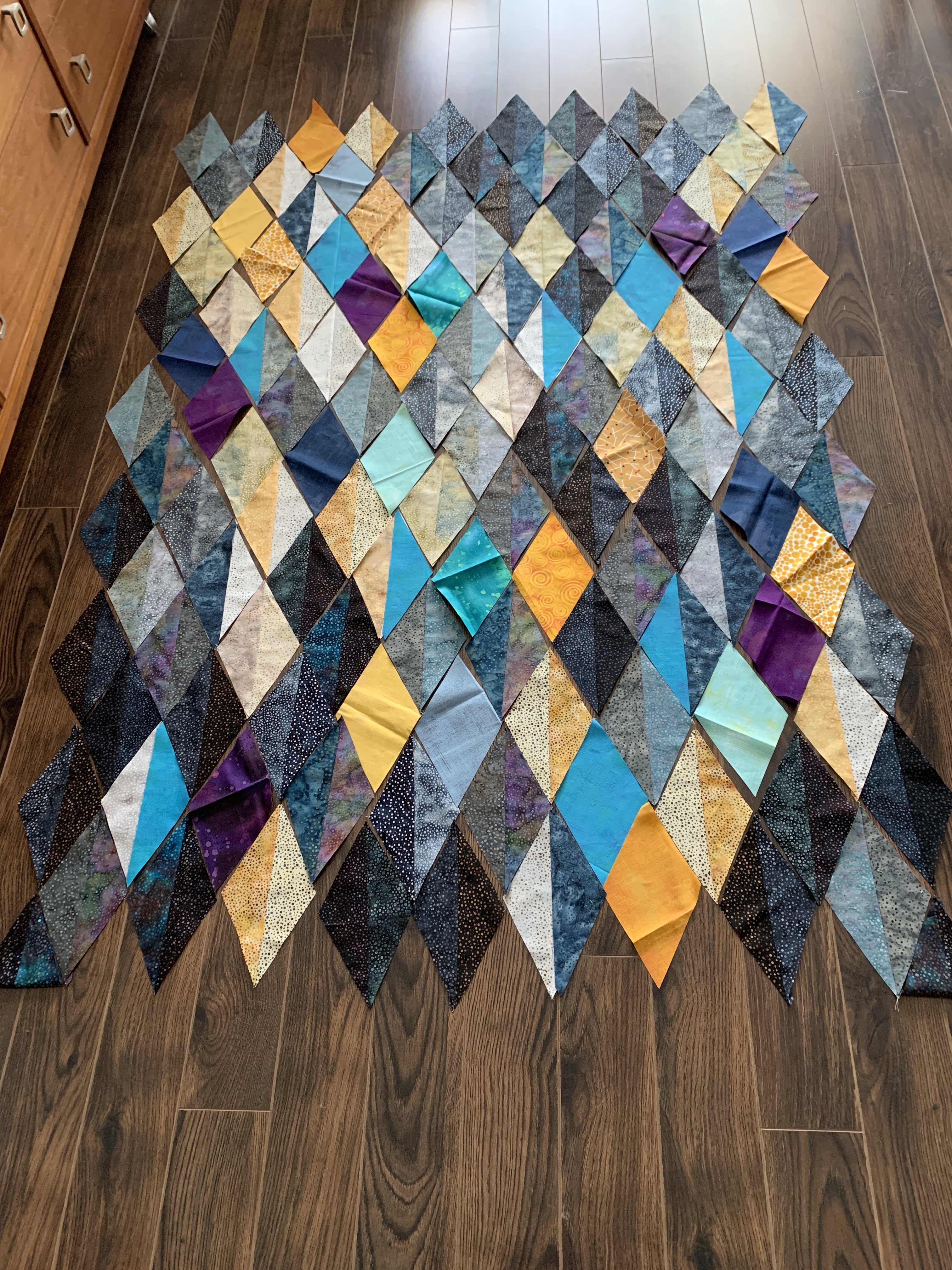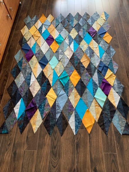 I began assembling diamonds starting in what will become the bottom right corner (or upper left – I’ll see later which way I think the quilt will work best).