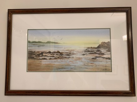 I want to do a lot of thread painting on the mud flats – browns into the blue fabric, blues/greys into the browns to obscure the fabric edges (If I can). Actually, I’ll start with the sky and work my way down to the bottom of the piece, including quite a bit on the bench and the gravel it’s sitting on to blend the two together a bit more.