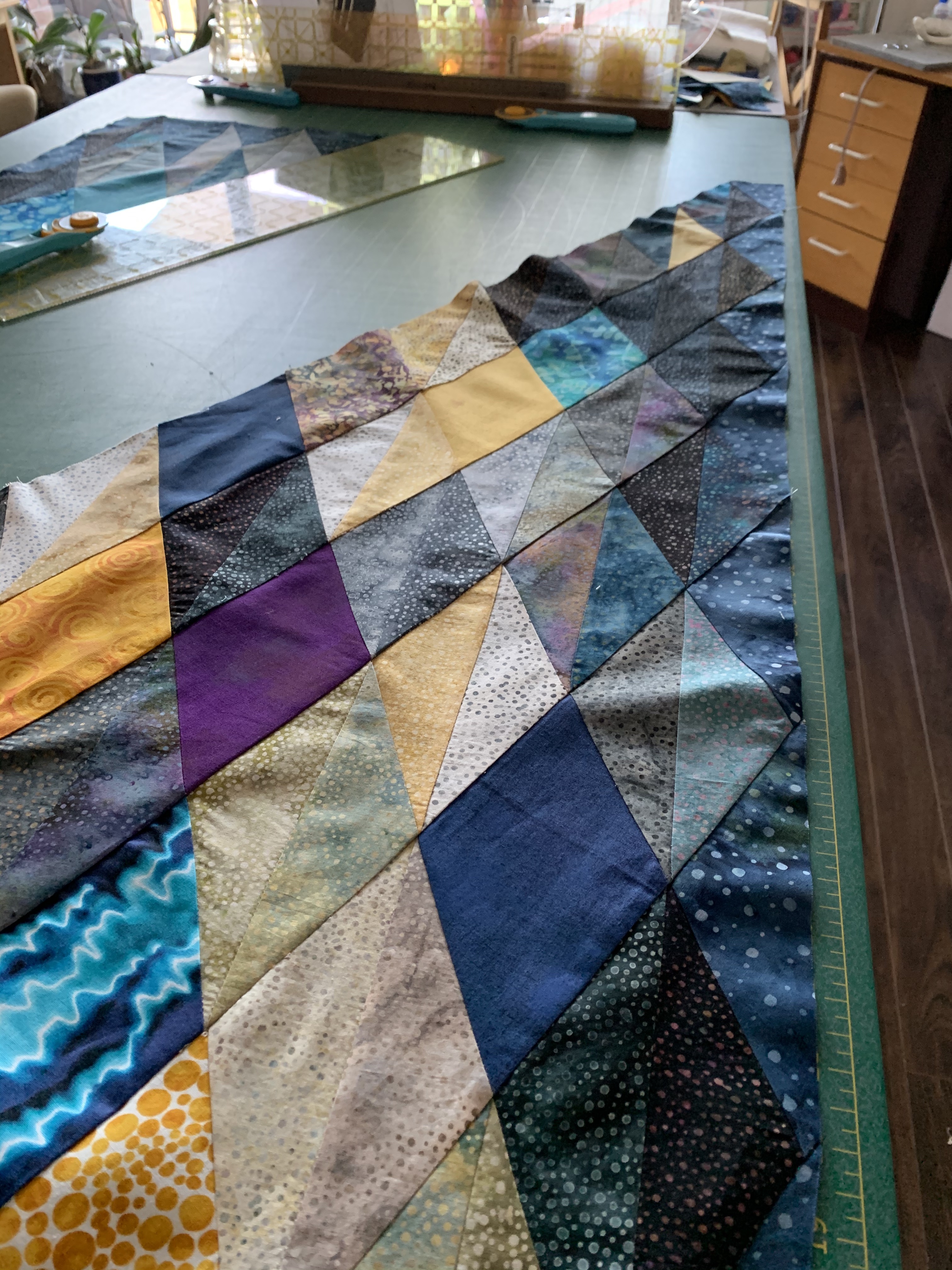 I wasn’t going to work on the Five Islands piece today but after lunch I found myself at the cutting table tidying up and before I knew it, I was picking up the small scraps of fabric and adding fusible web to each piece, then cutting them into shapes, next fusing them in place. And of course the next step was to peel the plastic backing from the photo printed on fabric, adding fusible web, fussy cutting out Ruby and the bench and pressing them into place.