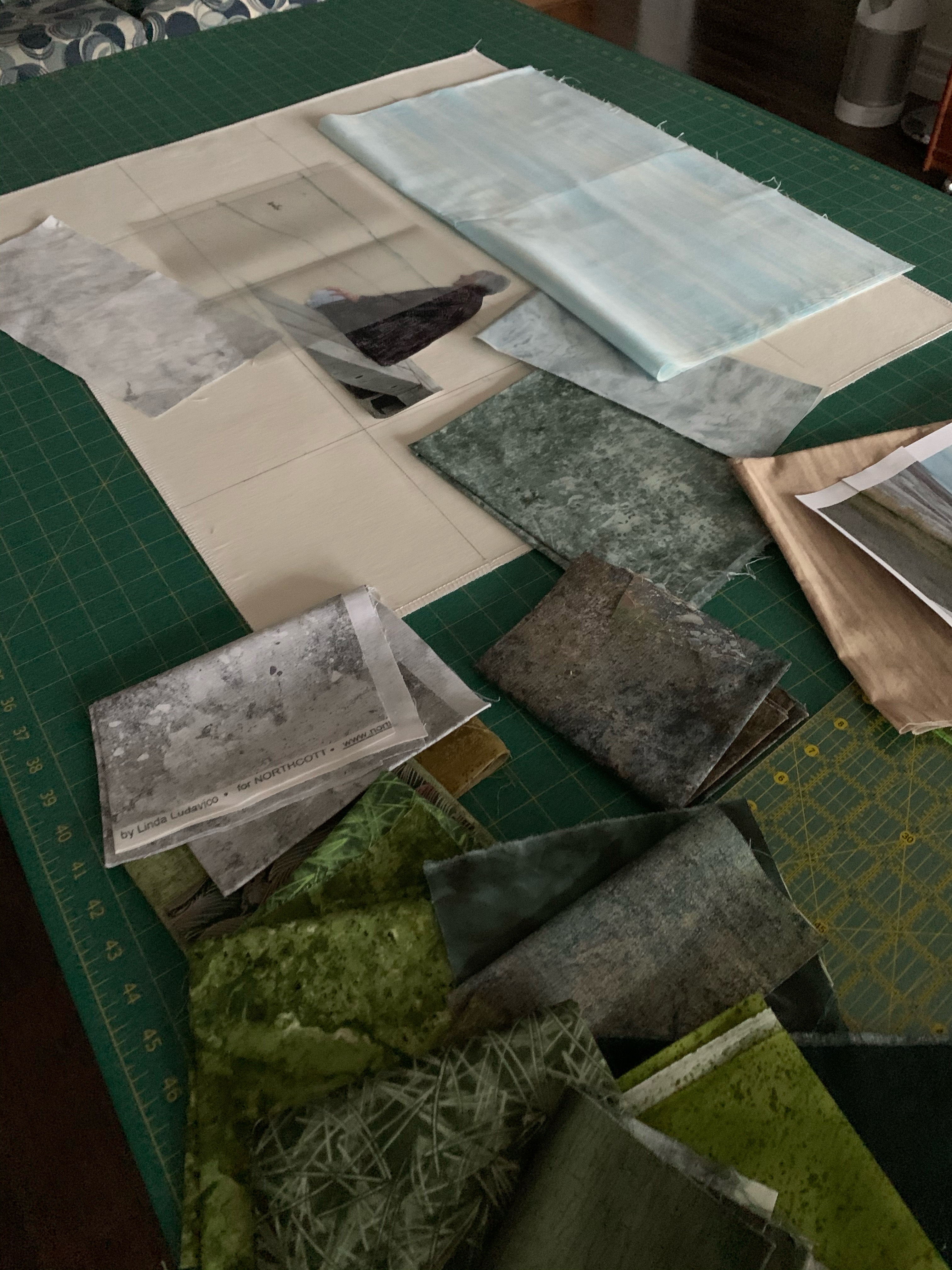 I moved on to selecting thread to use for the thread painting. While I was at it, I added a tiny bit of darkening to the sky with fabric pastels and pressing it to set the colours into the fabric. I might add a bit more grey in the upper right corner of the sky but not until I’ve done a bit of stitching, first.