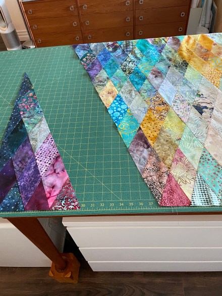 I’ve changed my construction method: instead of doing a single diagonal row at a time, I’m finding I get a more stable strip if I put together three diamonds at a time which is how I’ve laid them out, then stitch each short row and add it to the growing strip. This approach seems to keep the bias edges from losing shape better.