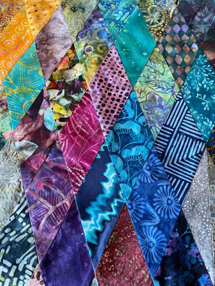 I can see from the photo I should have discarded ALL the original diamonds constructed from the jellyroll strips. When the panel is completed they’re not going to stick out because they’re mostly clustered in the dark upper corner but I’m aware of them and see the vertical lines they add. When the panel is quilted they will be obscured further (but I will know they are there).