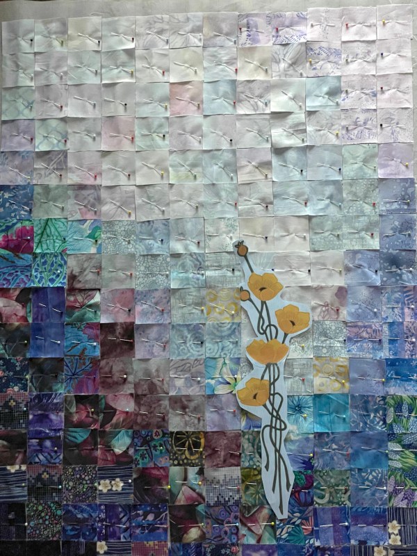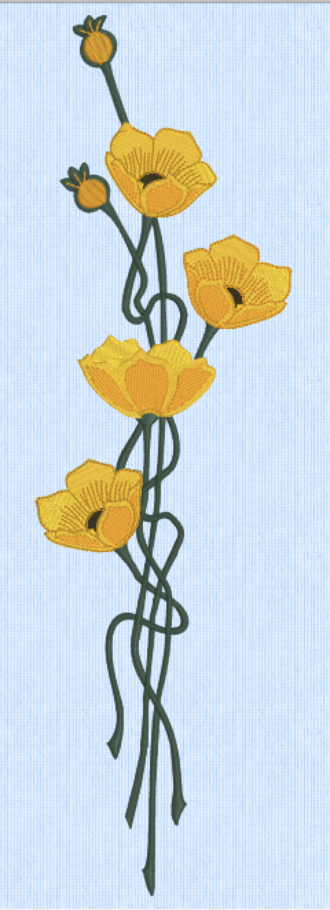 There is another possibility I’ve been working on – I’ve created a machine embroidery of 4 yellow poppies which are also ~ 14″ in height which I could embroider in position directly on the background: