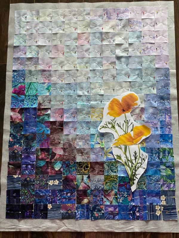 The image looks small but its height is 14″ – the panel will finish at 18″ X 24″ (it’s currently 24″ X 32″) so the flowers in relation to the background will be a better fit. I would print this image on fabric (using my inkjet printer), then fussy cut it carefully before fusing it to the background, and thread painting it in place.