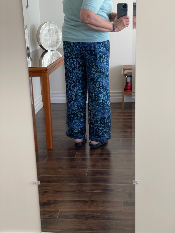 Fortunately, I had enough fabric left that I was able to start over – this time working with the complete rectangle (because my waist is almost the same as my hips) and cutting a single gusset for each leg (constructed by making the front and back gusset pieces into a single gusset piece). However, I didn’t have quite enough fabric for the legs – I cut 12″ from the bottom of the first try and added them to the bottom of the legs on this second try to give me enough leg length. I was going to do some decorative stitching to make the seam appear to be intentional but in fact you don’t notice the leg lengthening seam so I’ve left well enough alone.