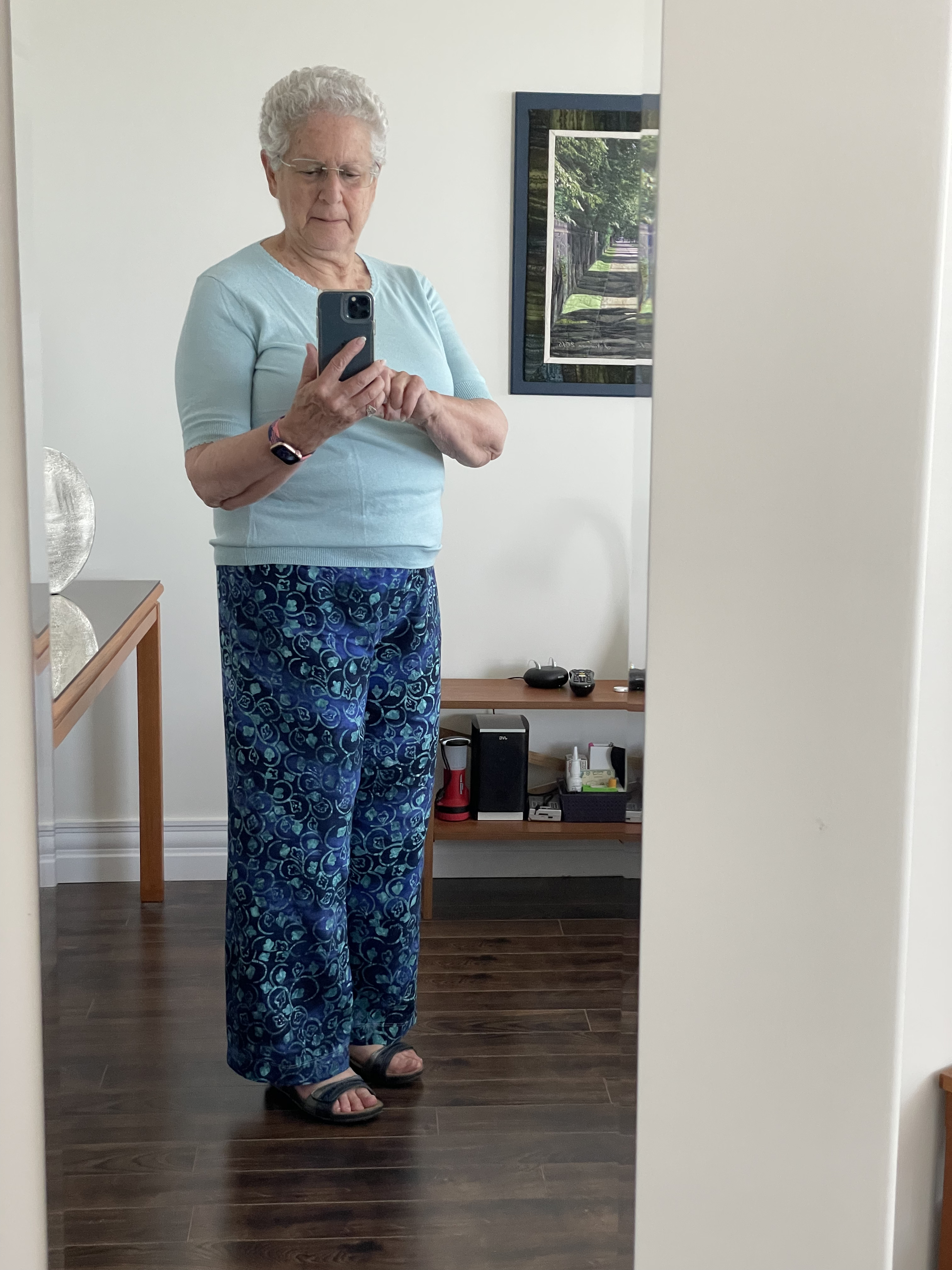 Fortunately, I had enough fabric left that I was able to start over – this time working with the complete rectangle (because my waist is almost the same as my hips) and cutting a single gusset for each leg (constructed by making the front and back gusset pieces into a single gusset piece). However, I didn’t have quite enough fabric for the legs – I cut 12″ from the bottom of the first try and added them to the bottom of the legs on this second try to give me enough leg length. I was going to do some decorative stitching to make the seam appear to be intentional but in fact you don’t notice the leg lengthening seam so I’ve left well enough alone.
