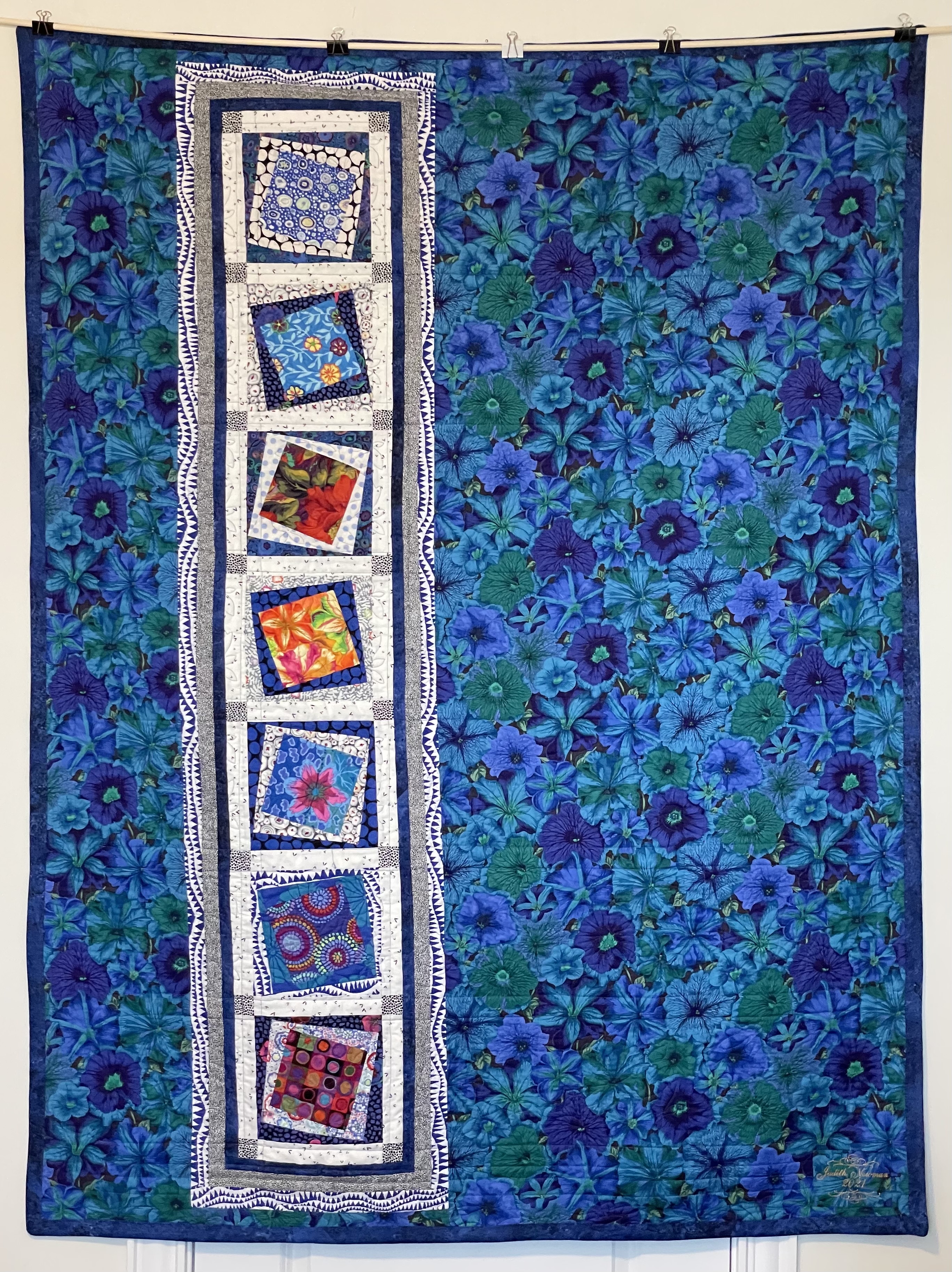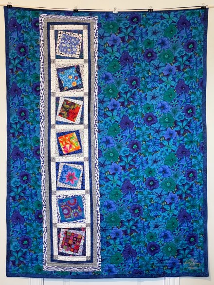 I finished with a hidden binding – I didn’t think the quilt front wanted another edge element. Besides, I didn’t have any more “petunia” fabric and used the darker blue stonehenge to finish the edge on the back.