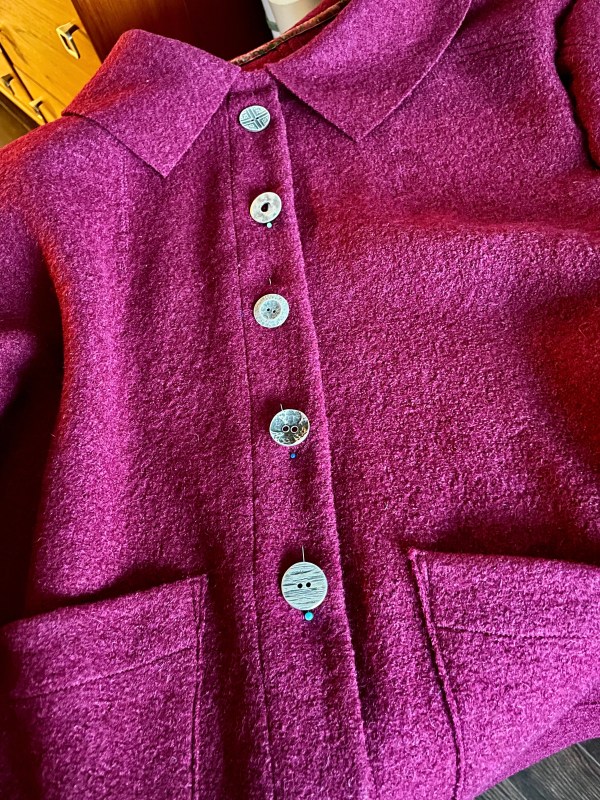 I happened across some beautiful actual wool boiled-wool at Fabricville about ten days ago. Just couldn’t resist it and bought enough to make a second jacket – heavier than the purple jacket I just finished.