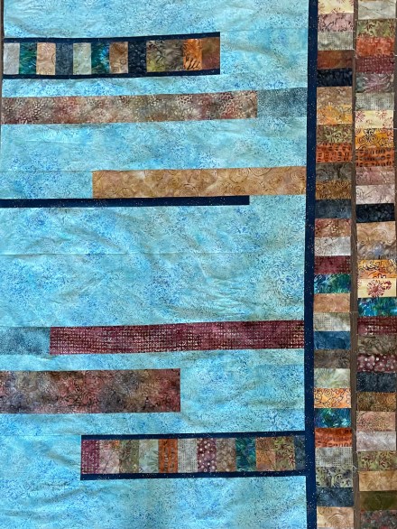 Now I have to think about binding fabric – I intend a hidden binding which will show only on the back side of the quilt; I suspect it should be pieced – I may be able to salvage enough from all four sides, after quilting, to make the binding strips which will then match (more or less) the four sides of the quilt! Wouldn’t that be nice. I’ll keep my fingers crossed.