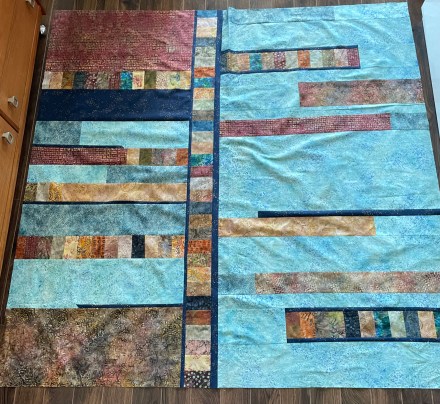 Just finished piecing the quilt back. I managed to get it a bit longer and a bit wider than the quilt top which will allow me to position the vertical pieced stripe further to the left a wee bit when I assemble the quilt sandwich.