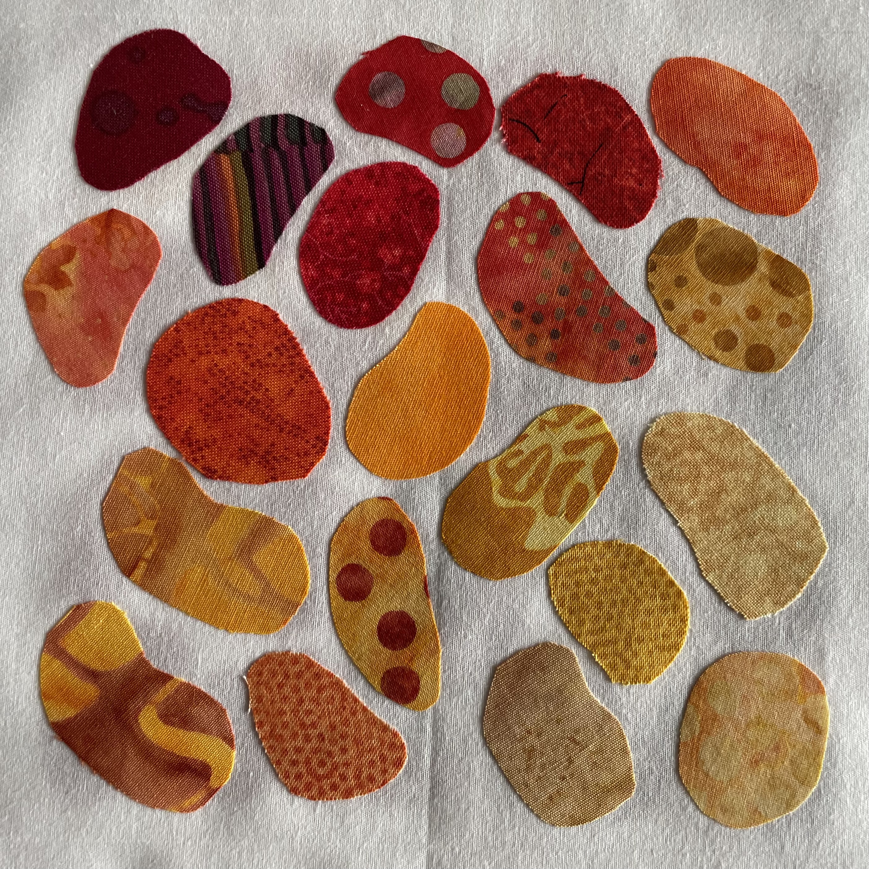 I cut out a 10.5″ x 10.5″ square of white fabric, then went to the box of scraps with fusible web already applied, pulled out the bag with red/orange/golden bits and cut out “bean” like shapes. I drew a centre 6″ x 6″ block, then filled the space.