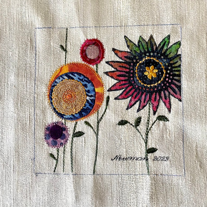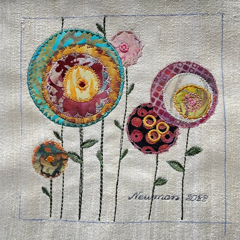 It’s taking about three hours to do each block what with the edge stitching on each piece of fabric, free motion stitching in the stems, stitching the leaves (which are decorative stitches) and embroidering the centres (which is taking way more time than I expected – for some reason my top thread is fraying when I’m embroidering so I get stops where I have to clean up the mess, backtrack the embroidery, then continue stitching.
