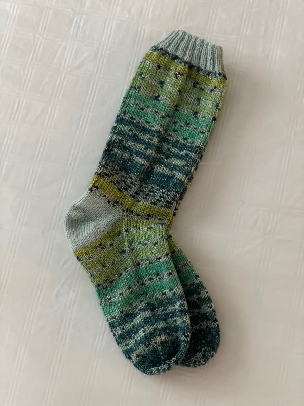 Finished this pair of socks last night – they’re a bit smaller than my standard sock. My massage therapist wears a size 7 shoe so while I made the legs with the same number of stitches as usual, I decreased from 64 to 60 stitches before the ankle and did fewer rows in the foot.