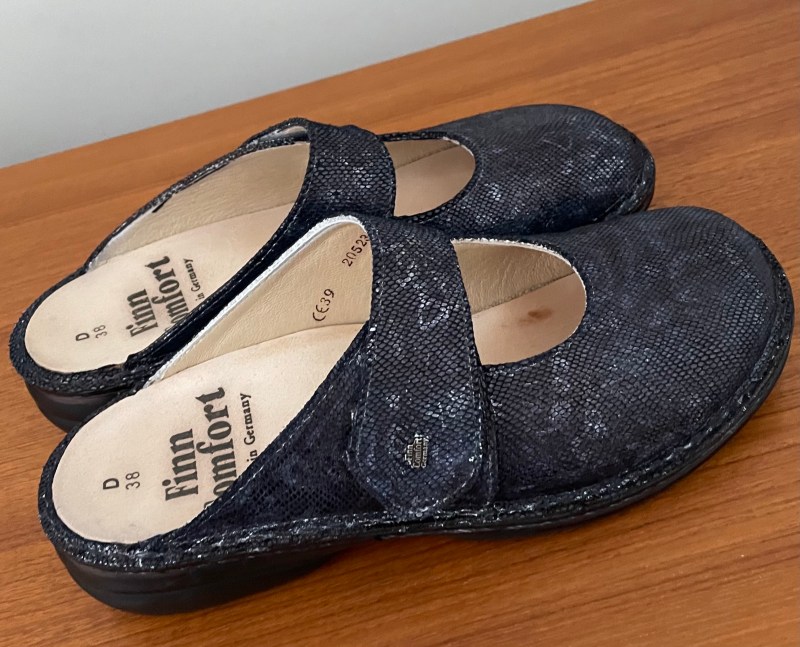 Why do I mention this? I wear clog/mule style shoes – shoes that slip on without a back heel – comfortable with my lovely collection of wool socks, easy to wear and actually orderable online because fit is forgiving in this kind of shoe. However, clog/mule shoes are becoming scarce as hen’s teeth – about the only company that seems to continue to make them is a German firm – Finn Comfort. I have several pair of Finn Comfort sandals (for summer) and clogs (for winter) but I didn’t have a black pair (and I need one because my reliable, comfortable Clarks clogs are all wearing out and are irreplaceable).