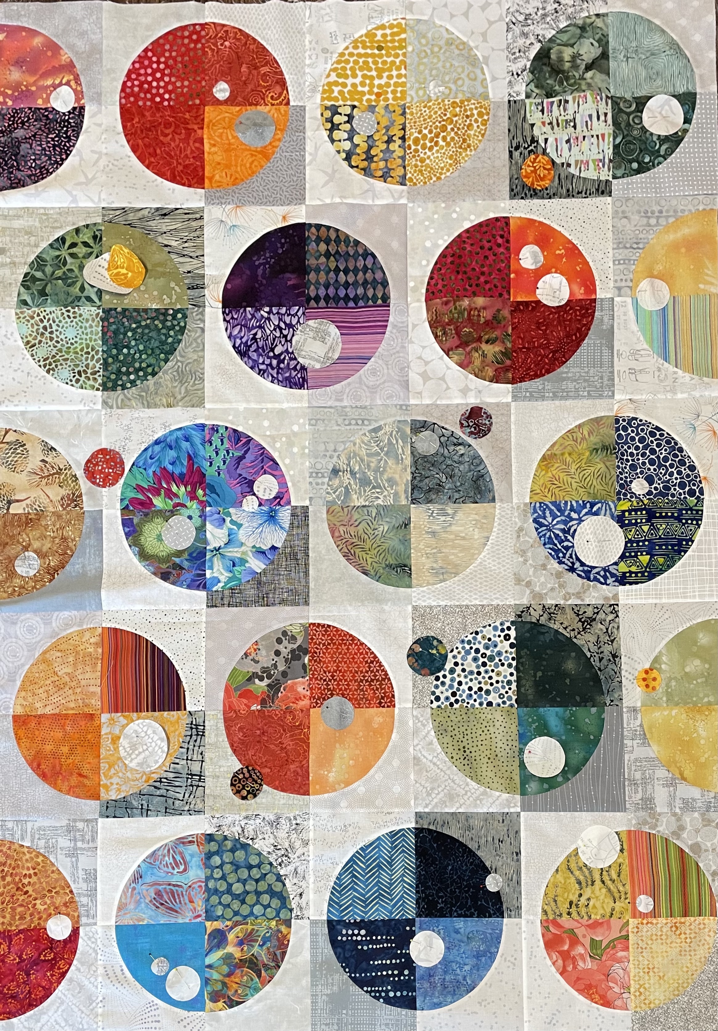 Here it is (for now). Today, I added a narrow batik inner border and a wider grey print outer border, both with mitred corners. Two things: the dark batik, which has sort of circular shapes, echoes the colours in the circles (Planets). The medium grey (with a darker grey print) blends the background elements.
