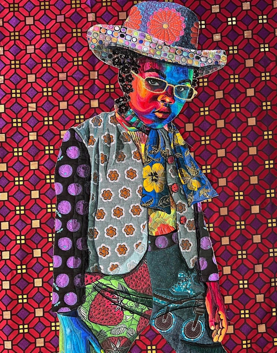 As much as I enjoy creating image wall art, I can’t begin to think in the manner and scale that Butler does – notice the roller skates on the pants, the hair, and glasses frames, the shadowing on the vest, the detail on his hat. Her wild choices of fabric, her amazingly done appliqué work, the juxtaposition of patterns are simply wonderful. My works are small – hers are massive!