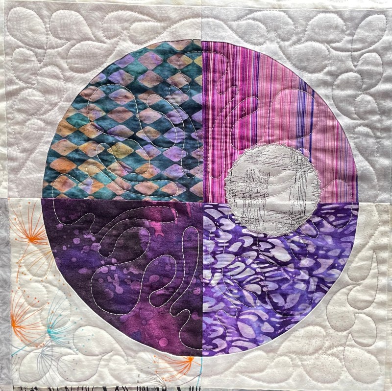 The challenge with quitting in the hoop is getting the embroideries to line up and join. Lots of math involved in trying to position and adjust the size of each embroidery so the stitching is precisely where you want it (my Pfaff Creative Icon 2 has a “precise positioning” capability which makes quilting in the hoop possible). I did “touch” the large circles in a few spots but for the most part I managed to avoid crossing the circle/square boundary. I stitched both sides of the narrow batik sashing in the ditch but chose not to add a quilting to that element, it was narrow enough that it didn’t require quilting.