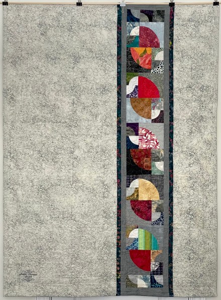 This quilt is an improvisation – I will randomly select a quarter circle and pair it with a grey background – I will do that for all of the pieces and hope the result will be interesting! When I constructed the strip for the back of my last quilt that’s what I did and the effect was more than pleasing. I’m aiming to make five strips which I will join using sashing of some sort or other – that decision I will make when I get there. Right now, my focus is on the blocks – both large and small. I’m expecting the blending of lights and darks (both with the large blocks and the small ones) will create an interesting colour flow!