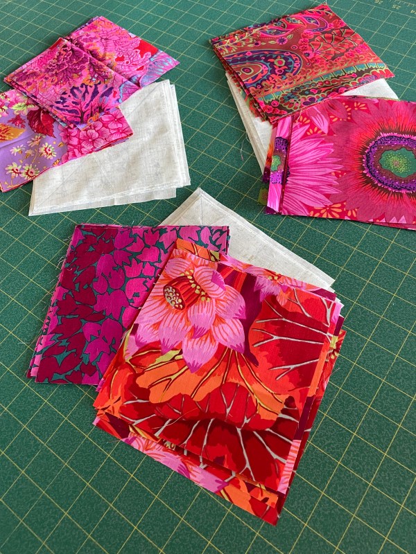 I’ve got all the prep work done. To make a 9 x 12 quilt I need 108 6″ squares – 12 are 6″ large scale prints (I’m using 2 of each print fabric), 96 are HST (half square triangles) constructed by pairing a 6 1/2″ backing square with a 6 1/2″ large print square, sewing 1/4″ beside the marked diagonal on each side, then cutting on the diagonal and trimming – creating two 6″ HST blocks.