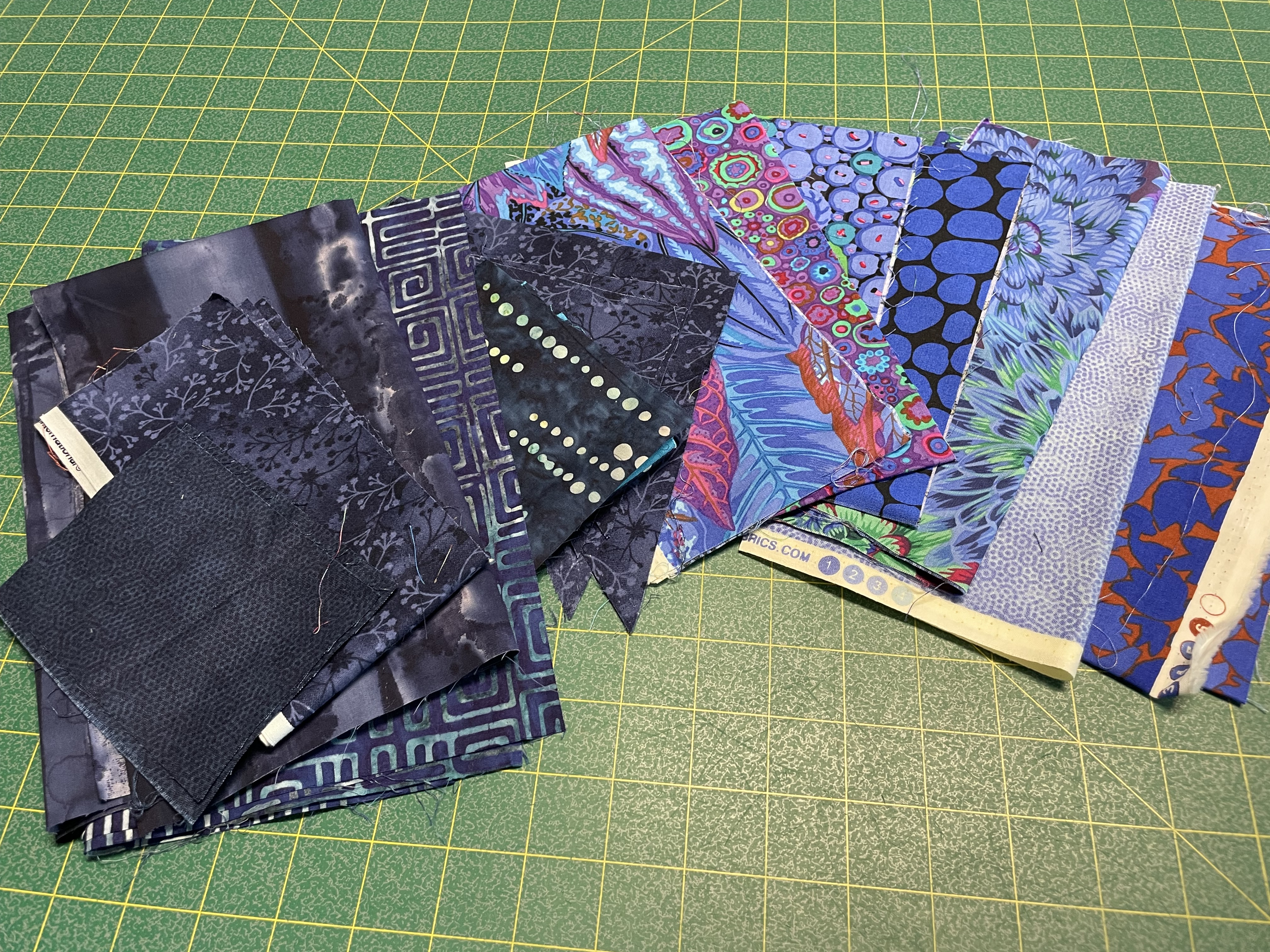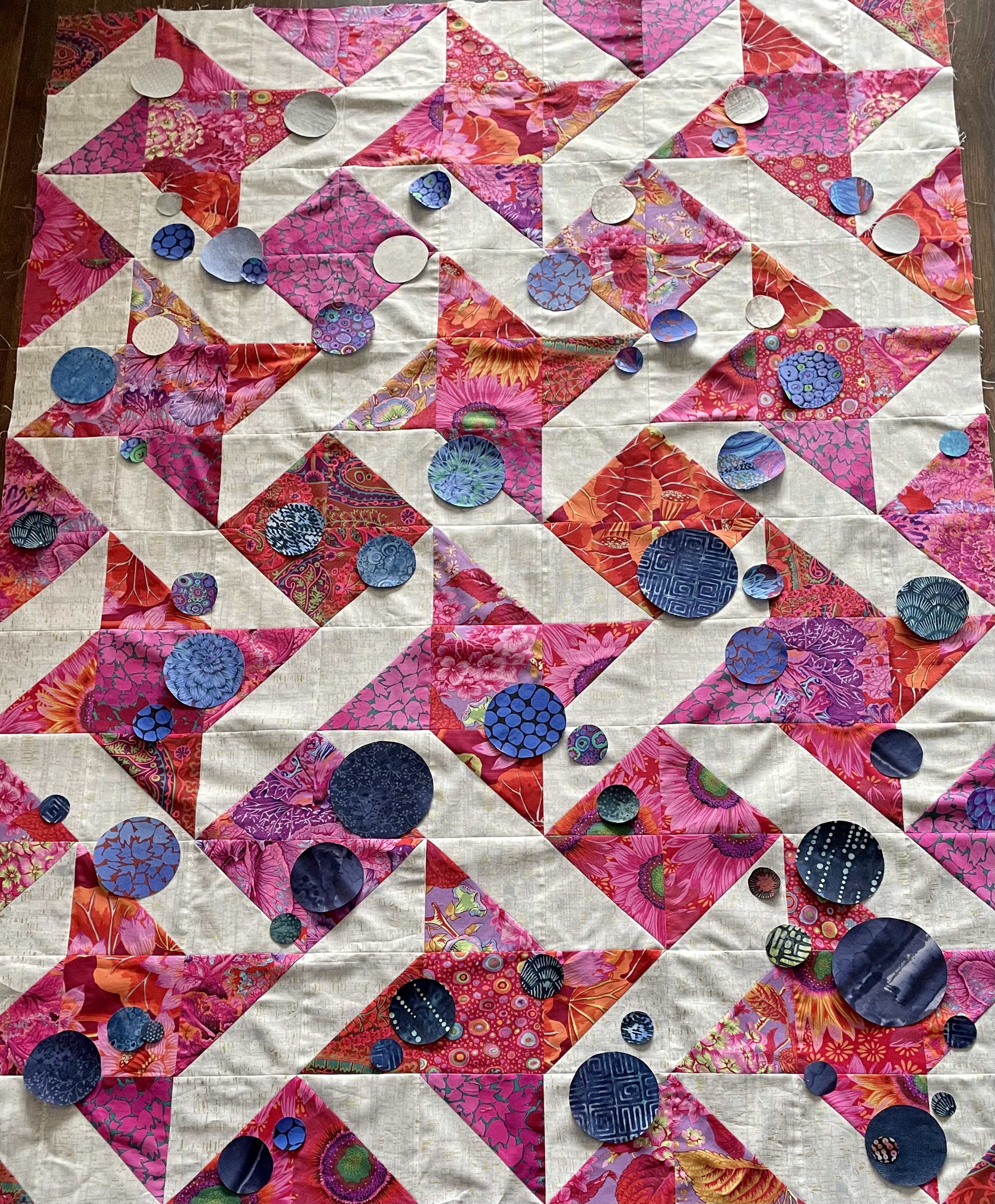 This is the layout at the moment. I realize nobody but me is going to notice the “clashes/repititions” that stand out for me. Besides, once I have the top stitched together, I’m thinking about appliqué of some sort in various dark purple/blue small prints (that will draw attention away from the overall fabric distribution beneath). I have no idea whether that should be circles of various sizes, or small diamonds (some of which might overlap), triangles? I’ve pulled several scraps